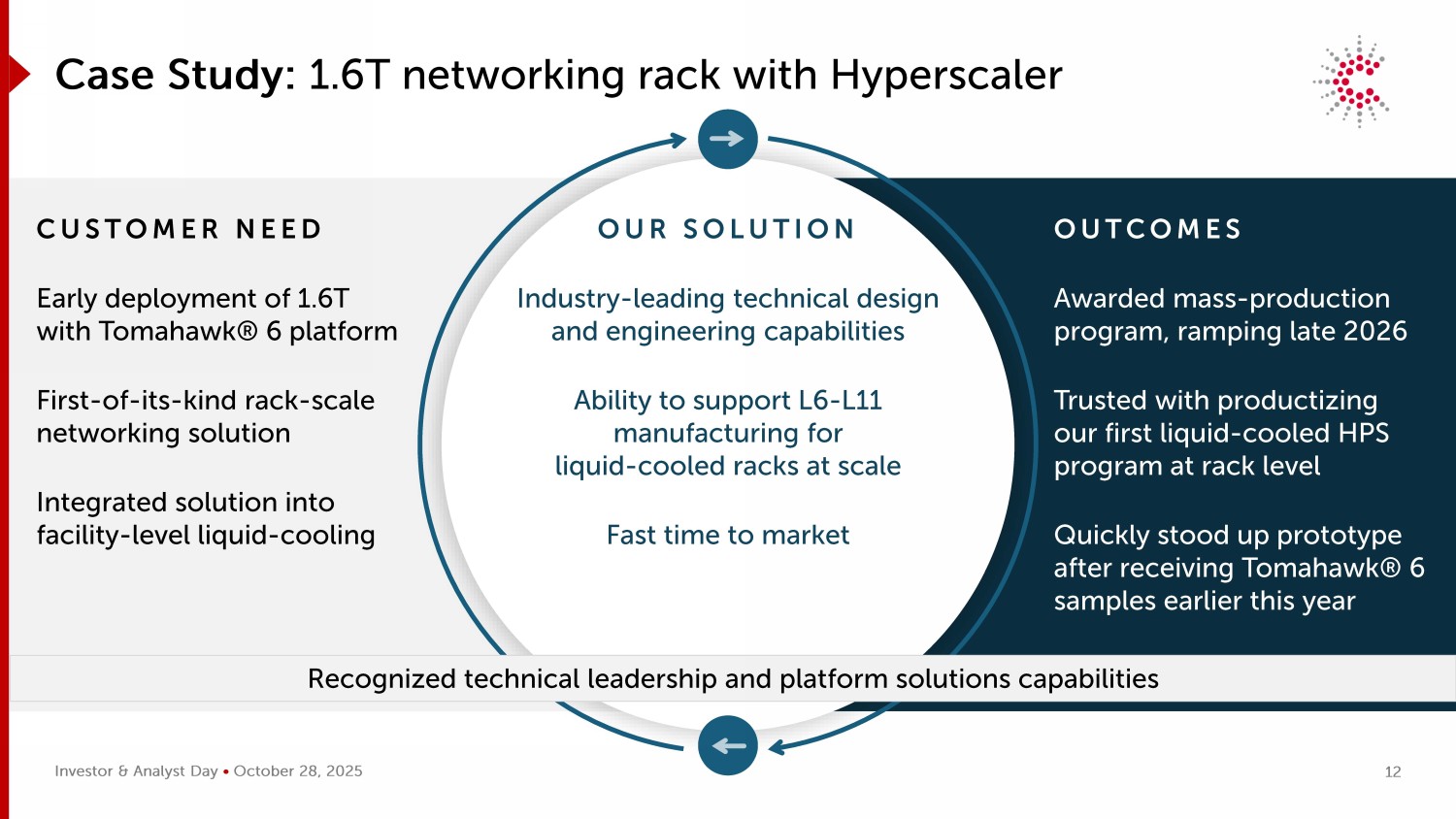 投资者&分析师日• 2025年10月28日案例分析:搭载超大规模的1.6T网络机架客户需要提前部署搭载战斧的1.6T®6平台首创同类机架规模组网解决方案集成解决方案成设施级液冷成果获批量产方案,2026年末爬坡被信任将我们的第一个液冷HPS程序产品化在机架级在收到战斧后迅速站起来原型®今年早些时候有6个样本我们的解决方案行业-领先的技术设计和工程能力,支持L6-L11大规模制造液冷机架的Ability快速上市时间公认的技术领先地位和平台解决方案能力12
