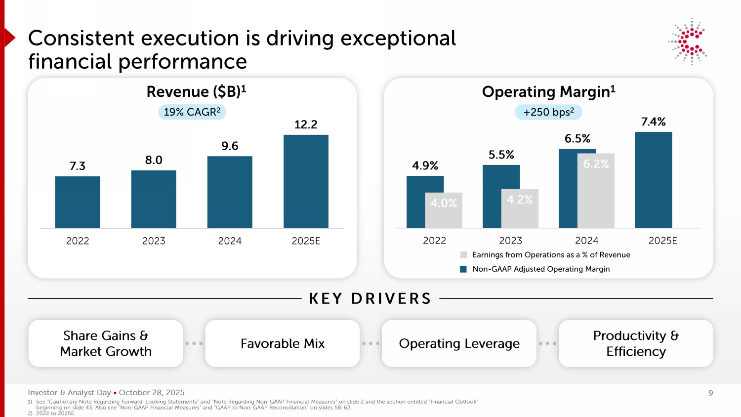 投资者&分析师日• 10月28日,20257.38.09.61 2.22022202320242025E收入4.9% 5.5% 6.5% 7.4% 4.0% 4.2% 6.2% 2022202320242025E一致的执行正在推动卓越的财务业绩关键驱动因素分享收益和市场增长生产力和效率经营杠杆有利的混合收入(B美元)1营业利润率1 + 250个基点219%的复合年增长率2运营收益占收入的百分比非公认会计原则调整后营业利润率1)见幻灯片2上的“关于前瞻性报表的注意事项”和“关于非公认会计原则财务措施的注意事项”以及幻灯片43开头的题为“财务展望”的选项。另见幻灯片58-62上的“非GAAP财务指标”和“GAAP与非GAAP对账”。2)2022至2025E。9