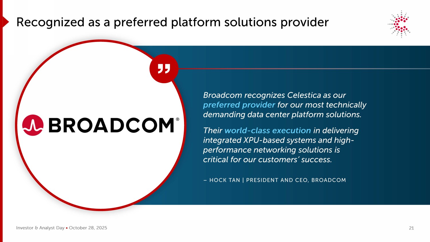 投资者&分析师日• 2025年10月28日被公认为首选平台解决方案提供商21 博通将天弘识别为我们对技术要求最高的数据中心平台解决方案的首选供应商。他们在交付基于XPU的集成系统和高性能网络解决方案方面的世界级执行对于我们客户的成功至关重要。– HOCK TAN | Broadcom总裁兼首席执行官