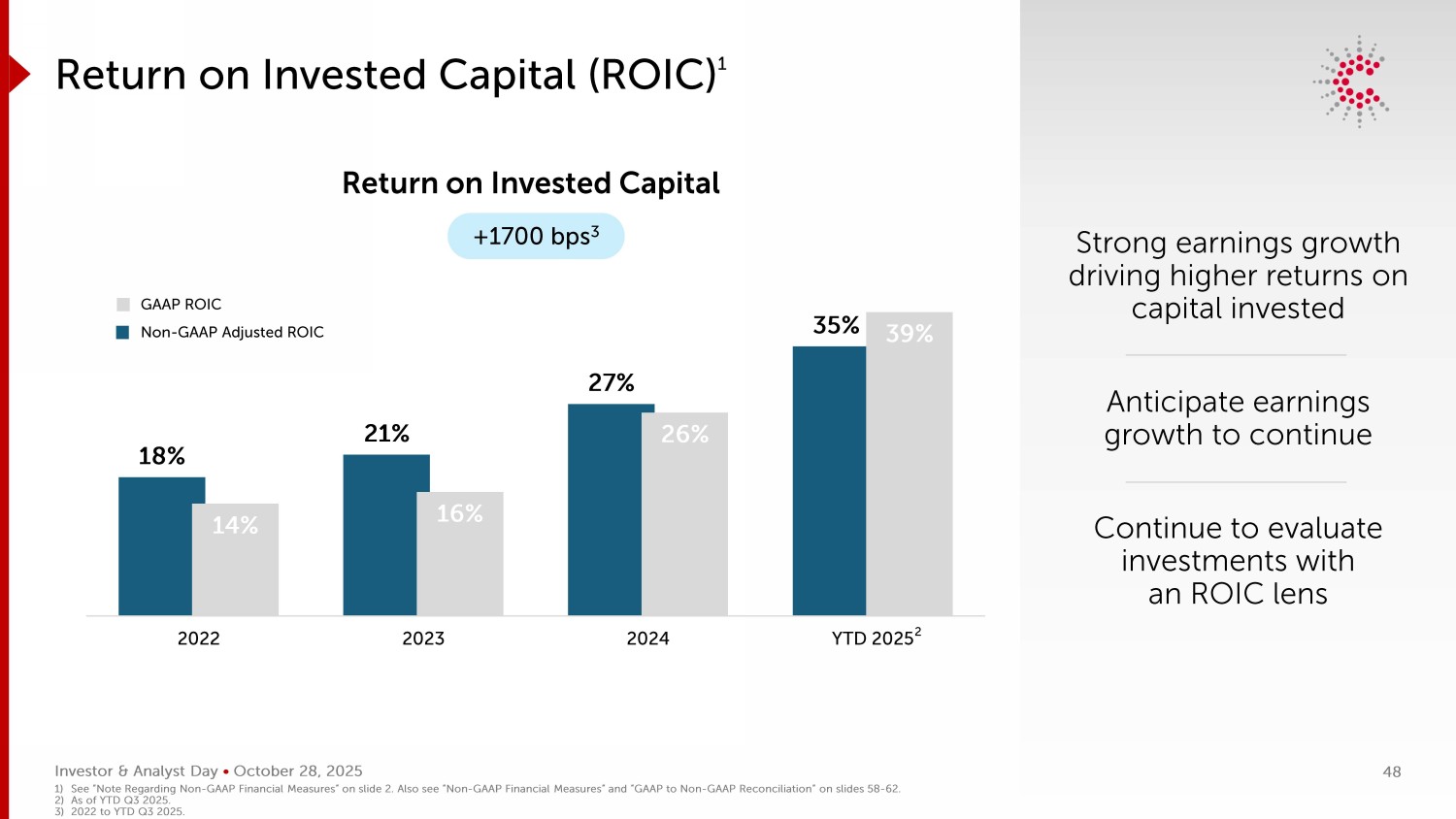 Investor & Analyst Day • 2025年10月28日18% 21% 27% 35% 14% 16% 26% 39% 202220232024年初至今2025年投资资本回报率(ROIC)1投资资本回报率+ 1700个基点3个GAAP ROIC Non-GAAP调整后ROIC 1)见幻灯片2“关于Non-GAAP财务指标的说明”。另见幻灯片58-62上的“非GAAP财务指标”和“GAAP与非GAAP对账”。2)截至2025年Q3年初至今。3)2022年至年初至今2025年第三季度。48强劲的盈利增长推动更高的资本投资回报率预期盈利增长将持续以ROIC镜头继续评估投资2