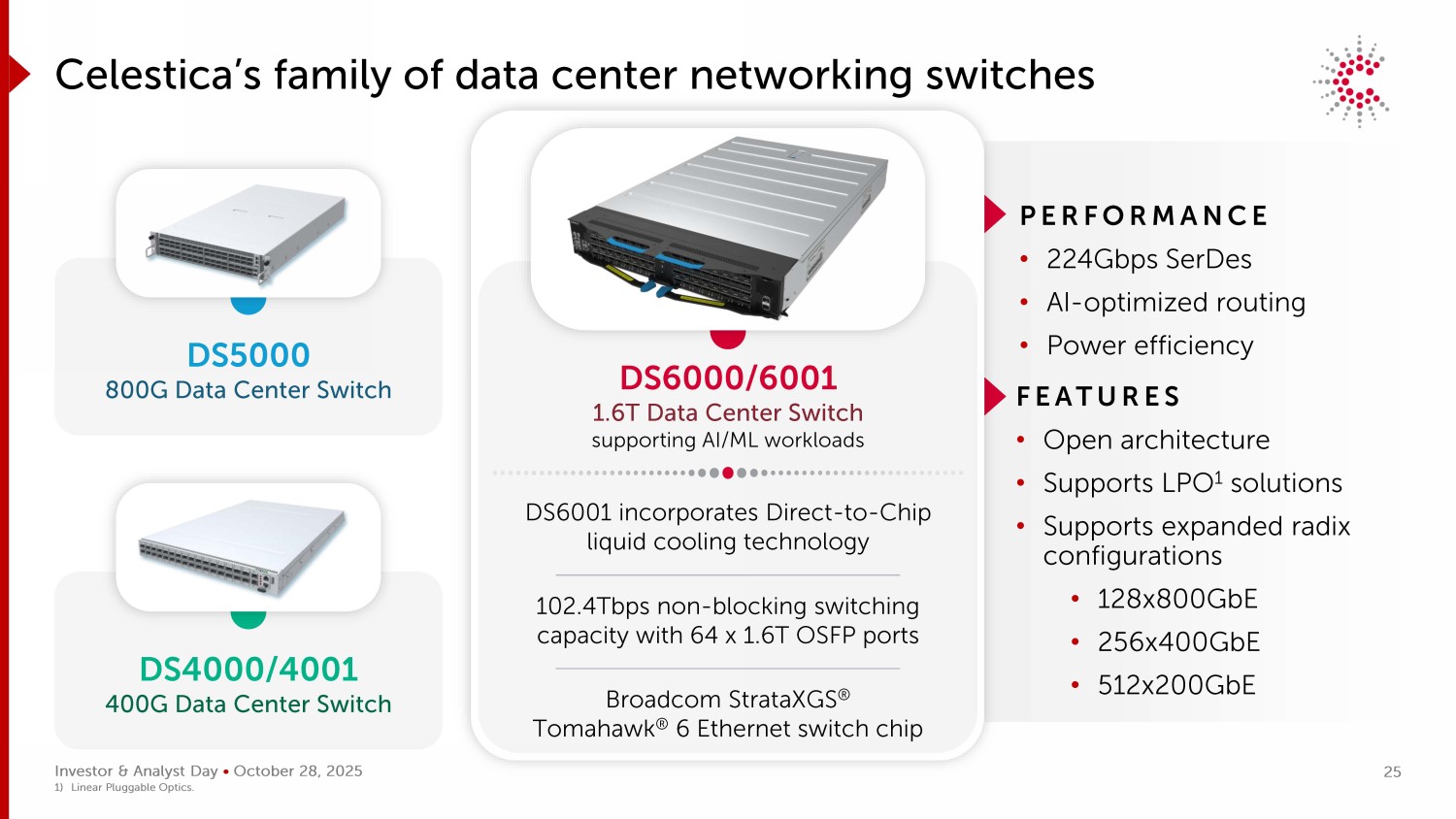 投资者&分析师日• 10月28日,2025特点•开放架构•支持LPO1解决方案•支持扩展radix配置• 128x800GB • 256x400GB • 512x200GB性能• 224Gbps Serdes • AI优化路由•能效DS6000/6001 1.6T数据中心交换机支持AI/ML工作负载Celestica的数据中心组网交换机系列DS5000 800G数据中心交换机DS4000/4001 4 00G数据中心交换机DS6001采用直接到芯片的液冷技术102.4Tbps无阻塞交换能力,具有64 x 1.6T OSFP端口博通 StrataXGS®战斧®6以太网交换机芯片1)线性可插拔光学。25