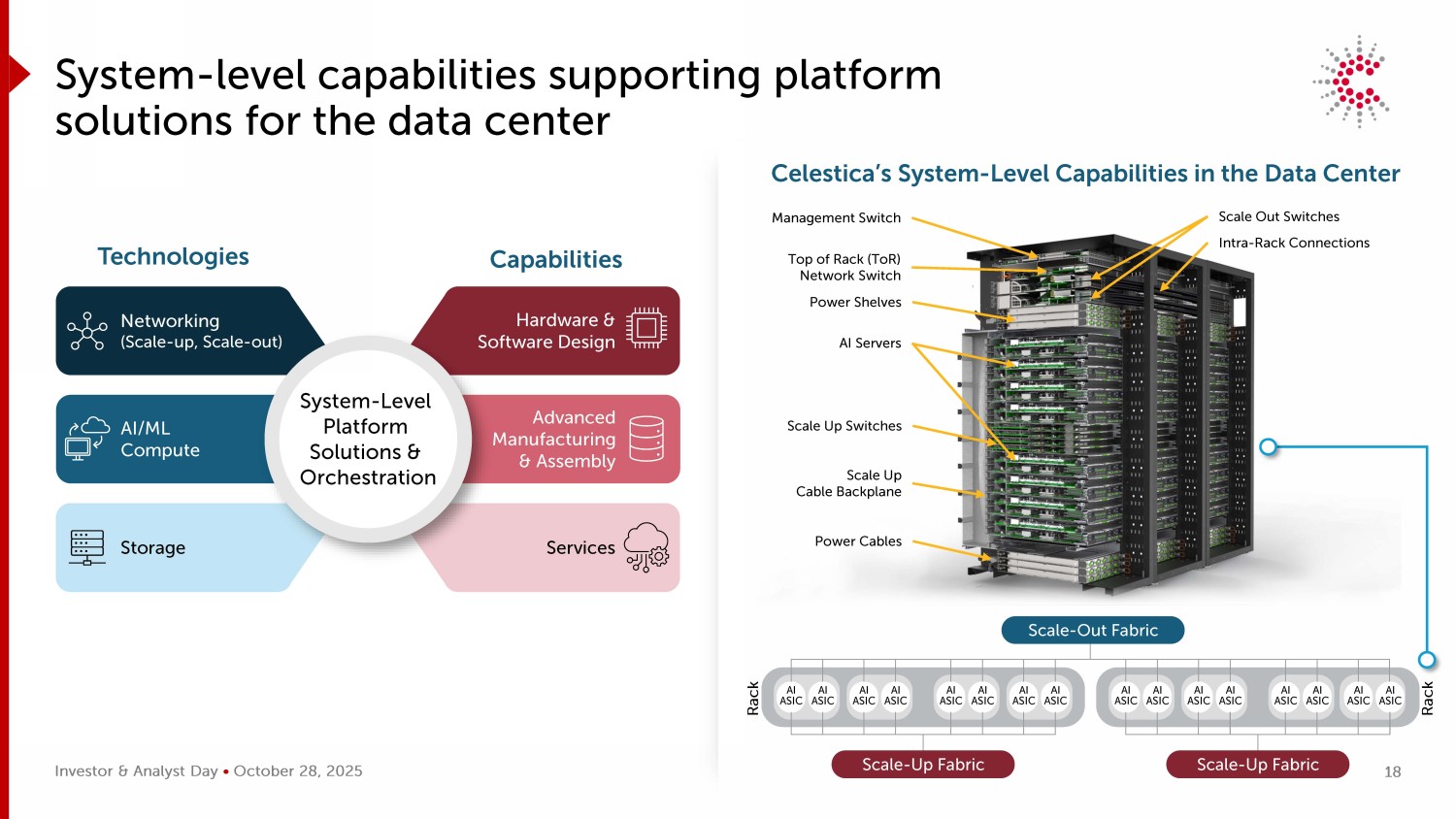 投资者&分析师日• 2025年10月28日Scale Up Cable Backplane Management Switch Top of Rack(TOR)Network Switch Scale Out Switch Power Shelves Intra-Rack Connections AI Servers Scale Up Switch Power Cables System Level Capabilities Supporting Platform Solutions for the Data Center Celestica’s System Level Capabilities in the Data Center Advanced Manufacturing & Assembly AI/ML Compute Services Storage Hardware & Software Design Networking(ScaleScale-out)系统级平台解决方案& Orchestration Technologies Capabilities AI ASIC AI ASIC AI ASIC AI ASIC AI ASIC AI ASIC AI ASIC AI ASIC AI ASIC AI ASIC AI ASIC AI ASIC AI ASIC AI ASIC AI ASIC AI ASIC AI ASIC AI ASIC AI ASIC AI ASIC AI ASIC AI ASIC Scale-out Fabric Scale-Up Fabric Scale-Up Fabric Rack Rack 18