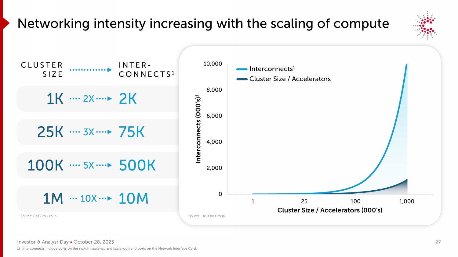 投资者&分析师日• 2025年10月28日组网强度随着计算集群大小INTER的缩放而增加-连接1 1K 2K 25K 75K 100K 500K 2X 3X 5X 10X 1M 10M 02,0004,0004,0006,0008,00010,0001,0001251001,000互连(000 ' s)1集群大小/加速器1)互连包括交换机上的端口(放大和缩小)和网络接口卡上的端口。资料来源:Dell’Oro Group资料来源:Dell’Oro Group 27