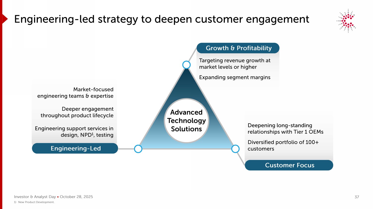 投资者和分析师日• 2025年10月28日,以市场水平或更高水平的收入增长为目标,扩大细分市场利润率,加深与一级原始设备制造商的长期合作关系,拥有100多家客户的多元化投资组合——专注于市场的工程团队和专业知识在整个产品生命周期中更深入地参与设计中的工程支持服务、NPD 1、测试工程-主导的战略,以加深客户参与度客户关注工程-主导的增长和盈利能力先进技术解决方案1)新产品开发。37