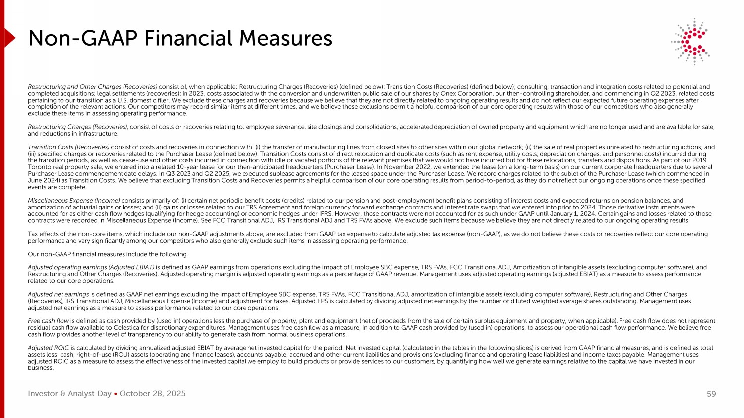 投资者和分析师日• 2025年10月28日非公认会计准则财务措施重组和其他费用(追偿)包括(如适用):重组费用(追偿)(定义见下文);过渡成本(追偿)(定义见下文);与潜在和已完成收购相关的咨询、交易和整合成本;法律和解(追偿);2023年,与我们当时的控股股东Onex Corporation转换和承销我们的股票相关的成本,并从2023年第二季度开始,与我们作为美国国内申报人的过渡相关的相关成本。我们将这些费用和回收排除在外,因为我们认为它们与持续的经营业绩没有直接关系,也没有反映我们在相关行动完成后的预期未来经营费用。我们的竞争对手可能会在不同时间记录类似的项目,我们认为这些例外情况允许我们将核心经营业绩与我们的竞争对手进行有益的比较,而我们的竞争对手在评估经营业绩时通常也会排除这些项目。重组费用(回收),包括与以下相关的成本或回收:员工遣散、场地关闭和合并、不再使用和可供出售的自有财产和设备的加速折旧,以及基础设施的减少。过渡成本(回收)包括与以下相关的成本和回收:(i)将生产线从封闭场地转移到我们全球网络内的其他场地;(ii)出售与重组行动无关的真实prope RTI es;以及(iii)与买方租赁(定义见下文)相关的特定费用或回收。过渡成本包括在过渡期间发生的直接重置租金和重复成本(如租金费用、水电费、折旧费和人事费),以及停止使用和其他与相关房地的闲置或空置部分有关的成本,如果没有这些搬迁、转移和处置,我们本不会发生这些成本。作为2019年多伦多房地产销售的一部分,我们为当时预期的总部签订了相关的10年租约(买方租约)。2022年11月,由于几个买方租约开始日期延迟,我们延长了当前公司总部的租约(长期)。在2023年第三季度和2025年第二季度,我们对买方租赁下的租赁空间执行了转租协议。我们将与买方租赁转租(2024年6月开始)相关的费用记录为过渡成本。我们认为,排除过渡成本和回收可以帮助比较我们不同时期的共同经营业绩,因为一旦这些特定事件完成,它们并不反映我们正在进行的经营。杂项费用(收入)主要包括:(i)与我们的养老金和离职后福利计划相关的某些净定期福利成本(贷项),包括养老金余额的利息成本和预期回报,以及精算损益的摊销;(ii)与我们在2024年之前签订的TRS协议和外币远期汇兑合同以及利率掉期相关的损益。根据国际财务报告准则,这些衍生工具要么作为现金流量套期(符合套期会计条件),要么作为经济套期入账。然而,这些cont rac ts直到2024年1月1日才在GAAP下入账。与这些合同有关的某些损益记入杂项费用(收入)。见上文FCC过渡性ADJ、IRS过渡性ADJ和TRS FVA。我们排除了这些项目,因为我们认为它们与我们的持续经营业绩没有直接关系。非核心项目的税收影响,包括我们上面的非GAAP调整,被排除在GAAP税收费用之外,以计算调整后的税收费用(非GAAP),因为我们认为这些成本或回收并不反映我们的核心经营业绩,并且在我们的竞争对手中差异很大,他们在评估经营业绩ANC E时也普遍排除了这些项目。我们的非GAAP财务指标包括:调整后营业利润(Adjusted EBIAT)定义为GAAP营业利润,不包括员工SBC费用、TRS FVA、FCC过渡性ADJ、无形资产的AMO RT化(不包括计算机软件)以及重组和其他费用(回收)的影响。调整后的营业利润率是调整后的营业利润占GAA市盈率的百分比。管理层使用调整后的运营收益(Adjusted EBIAT)作为评估与我们核心业务相关的绩效的衡量标准。调整后的净利润定义为GAAP净利润,不包括员工SBC费用、TRS FVA、FCC过渡性ADJ、i无形资产摊销(不包括计算机软件)的影响, 重组和其他费用(回收)、IRS过渡性ADJ、杂项费用(收入)和税收调整。调整后每股收益的计算方法是按稀释后的加权平均已发行股份数量计算调整后的净利润。管理层使用调整后净收益作为评估与我们核心业务相关的业绩的衡量标准。自由现金流定义为运营提供(用于)的现金减去购买物业、厂房和设备(扣除某些剩余设备和财产的销售收益,如适用)。自由现金流不代表天弘可用于可自由支配支出的剩余现金流。管理层使用自由现金流作为衡量标准,将其添加到由(用于)运营提供的GAAP现金中,以评估我们的运营现金流表现。我们认为,自由现金流为我们从正常业务运营中产生现金的能力提供了另一个层次的透明度。调整后的ROIC的计算方法是年化调整后EBIAT除以当期平均净投资资本。净投资资本(cal cu lated in the tables in the following slides)源自GAAP财务指标,定义为总资产减去:现金、使用权(ROU)资产(经营和融资租赁)、应付账款、应计和其他流动负债关系和准备金(不包括融资和经营租赁负债)以及应付所得税。管理层使用调整后的ROIC作为衡量标准,通过量化我们相对于我们已投资于业务的资本产生收益的情况,来评估我们用于向客户构建产品或提供服务的投资资本的有效性。59