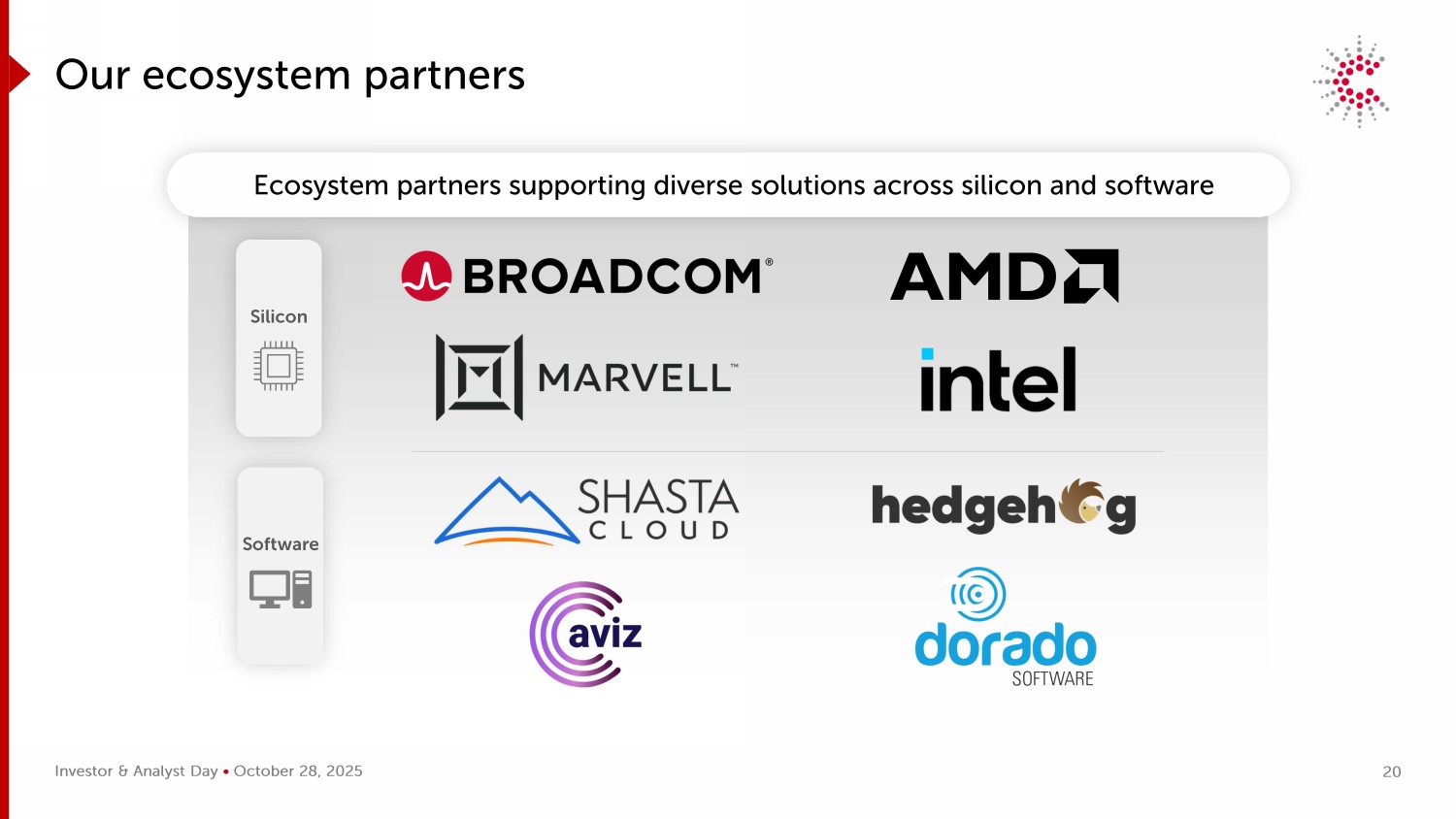 投资者和分析师日• 2025年10月28日我们的生态系统合作伙伴Silicon Software生态系统合作伙伴支持跨硅和软件的多种解决方案20