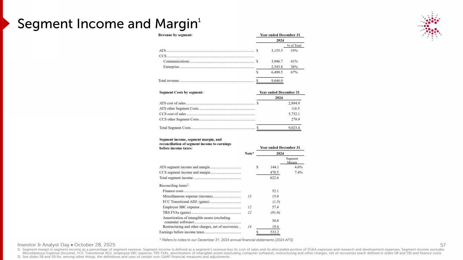 投资者&分析师日• 2025年10月28日分部收益及保证金1*参考我们2024年12月31日年度财务报表(2024年AFS)1)的附注分部利润率是分部收入占分部收入的百分比。分部收入定义为分部的收入减去销售成本及其SG & A费用和研发费用的可分配部分。分部收入不包括杂项费用(收入)、FCC过渡性ADJ、员工SBC费用、TRS FVA、无形资产摊销(不包括udi ng计算机软件)、重组和其他费用,扣除回收(每项定义见幻灯片58和59)和财务成本s. 2),除其他外,有关某些非公认会计原则财务措施和调整的定义和用途,请参见幻灯片58和59。57