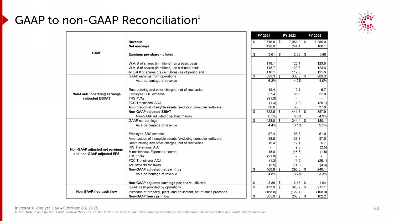 Investor & Analyst Day • 2025年10月28日2024财年2023财年2022财年收入9,646.0美元7,961.0美元7,250.0美元净收益428.02 44.4 180.1每股收益-稀释后3.61美元2.03美元1.46美元W.A. #股(百万),基本基准118.11 20.11 23.5 W.A. #股(百万),稀释后118.71 20.31 23.6截至期末实际股数o/s(百万)116.11 19.01 21.6 GAAP运营收益599.3美元338.3美元289.3美元占收入的百分比6.2% 4.2% 4.0%重组和其他费用,扣除追偿款19.41 2.16.7员工SBC费用57.455.65 1.0 TRS FVA(91.0)--FCC过渡性ADJ(1.3)(1.2)(26.1)无形资产摊销(不包括计算机软件)38.8 36.83 7.0 Non-GAAP调整后EBIAT 622.6 $ 441.6 $ 357.9 $ Non-GAAP调整后营业利润率6.5% 5.5% 4.9% GAAP净收益428.0 $ 244.4 $ 180.1 $占收入百分比4.4% 3.1% 2.5%员工SBC费用57.455.65 1.0无形资产摊销(不包括计算机软件)38.8 36.83 7.0重组和其他费用,扣除追回款19.41 2.16.7 IRS过渡性ADJ-9.0(2.5)杂项费用(收入)15.0(46.6)(1.5)TRS FVA(91.0)--FCC过渡性ADJ(1.3)(1.2)(26.1)税收调整(5.5)(14.3)(4.6)Non-GAAP调整后净收益460.8 $ 295.8 $ 240.1 $占收入的百分比4.8% 3.7% 3.3% Non-GAAP调整后每股收益-摊薄3.88 $ 2.46 $ 1.94 $ GAAP运营提供的现金473.9 $ 326.2 $ 211.1 $购买物业、厂房和设备,扣除销售收益(168.0)(122.4)(108.9)Non-GAAP自由现金流305.9 $ 203.8 $ 102.2 $ GAAP Non-GAAP调整后净收益和Non-GAAP调整后EPS Non-GAAP自由现金流Non-GAAP运营收益(调整后EBIAT)GAAP与Non-GAAP调节11)见幻灯片2“关于Non-GAAP财务措施的说明”。另请参见幻灯片58和59,了解某些非公认会计准则财务指标的定义和用途等。60