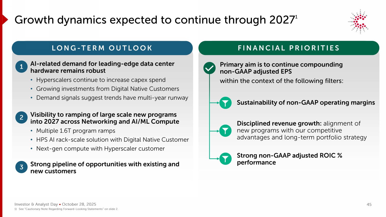 投资者&分析师日• 10月28日,2025年增长动态预计将持续到2027年1长期展望财务优先事项1对领先数据中心硬件的人工智能相关需求保持强劲•超大规模厂商继续增加资本支出•数字原生客户的投资不断增长•需求信号表明趋势具有多年的跑道2可见性,大型新项目将在2027年跨网络推广和AI/ML Compute •多个1.6T项目坡道• HPS AI机架规模解决方案与数字原生客户•下一代计算与Hyperscaler客户3现有客户和新客户的强大机会管道主要目标是在以下过滤器的背景下继续复合非GAAP调整后每股收益:非GAAP营业利润率的可持续性有纪律的收入增长:新项目与我们的竞争优势和长期投资组合战略保持一致强劲的非GAAP调整后ROIC %表现1)见幻灯片2的“关于前瞻性陈述的注意事项”。45