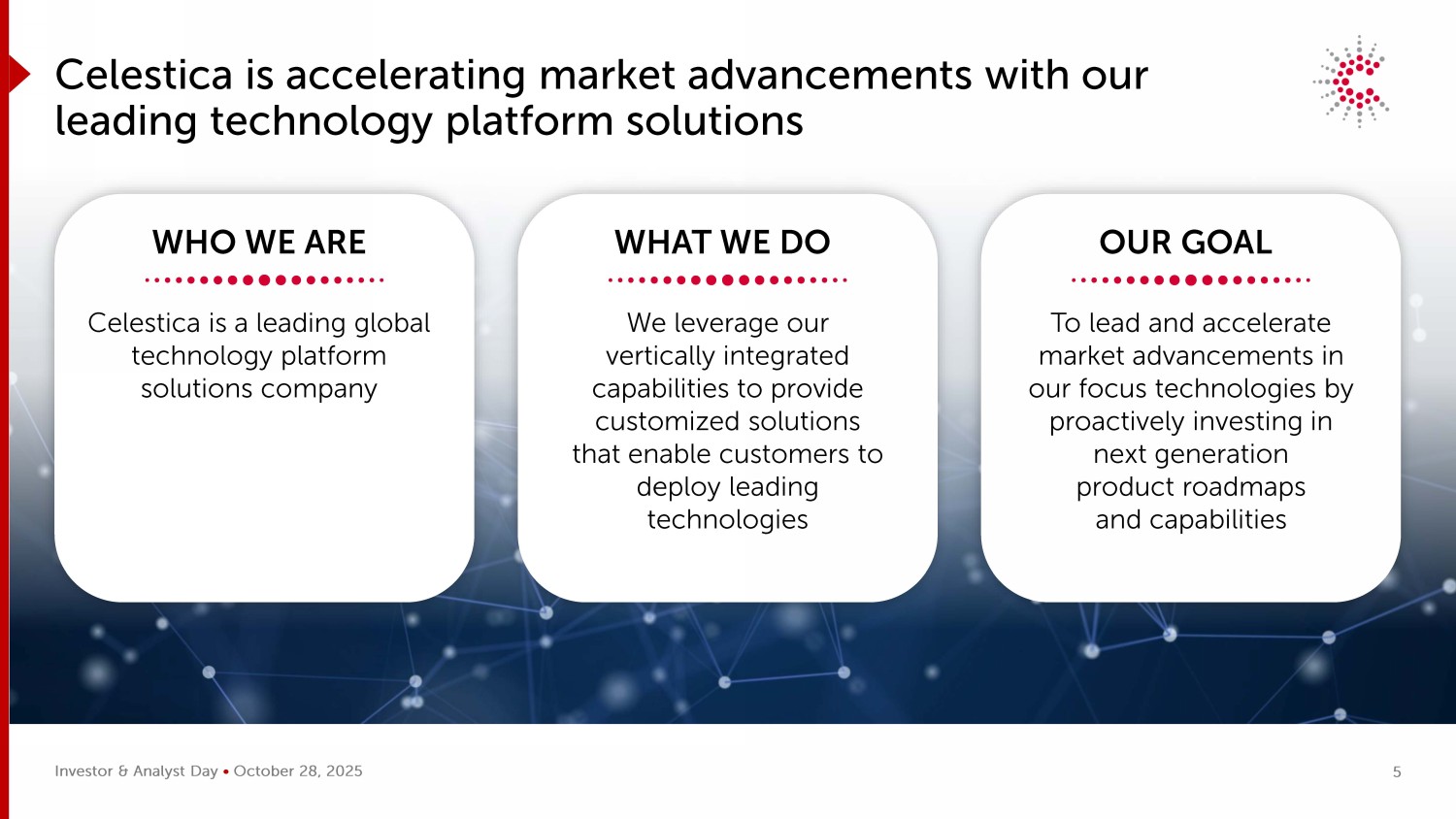 Investor & Analyst Day • 2025年10月28日Celestica正在通过我们领先的技术平台解决方案加速市场进步我们是谁Celestica是一家全球领先的技术平台解决方案公司我们利用我们的垂直整合能力提供定制解决方案,使客户能够部署领先技术我们所做的工作,通过主动投资于下一代产品路线图和能力来引领和加速我们重点技术的市场进步我们的目标5