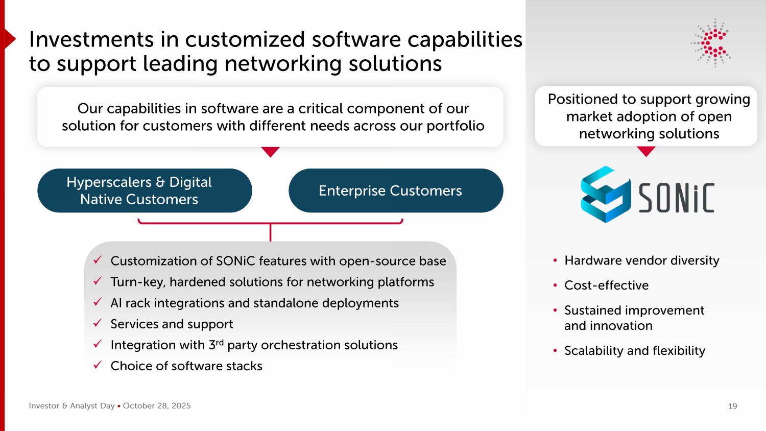 投资者和分析师日• 2025年10月28日企业客户投资定制软件能力以支持领先的网络解决方案我们在软件方面的能力是我们解决方案的关键组成部分,适用于我们产品组合中有不同需求的客户•硬件供应商多样性•具有成本效益•持续改进和创新•可扩展性和灵活性超大规模和数字原生客户的定位是支持开放网络解决方案日益增长的市场采用x定制具有开源基础的SONiC功能x交钥匙,网络平台的强化解决方案x AI机架集成和独立部署x服务和支持x与第三方编排解决方案的集成x软件堆栈的选择19