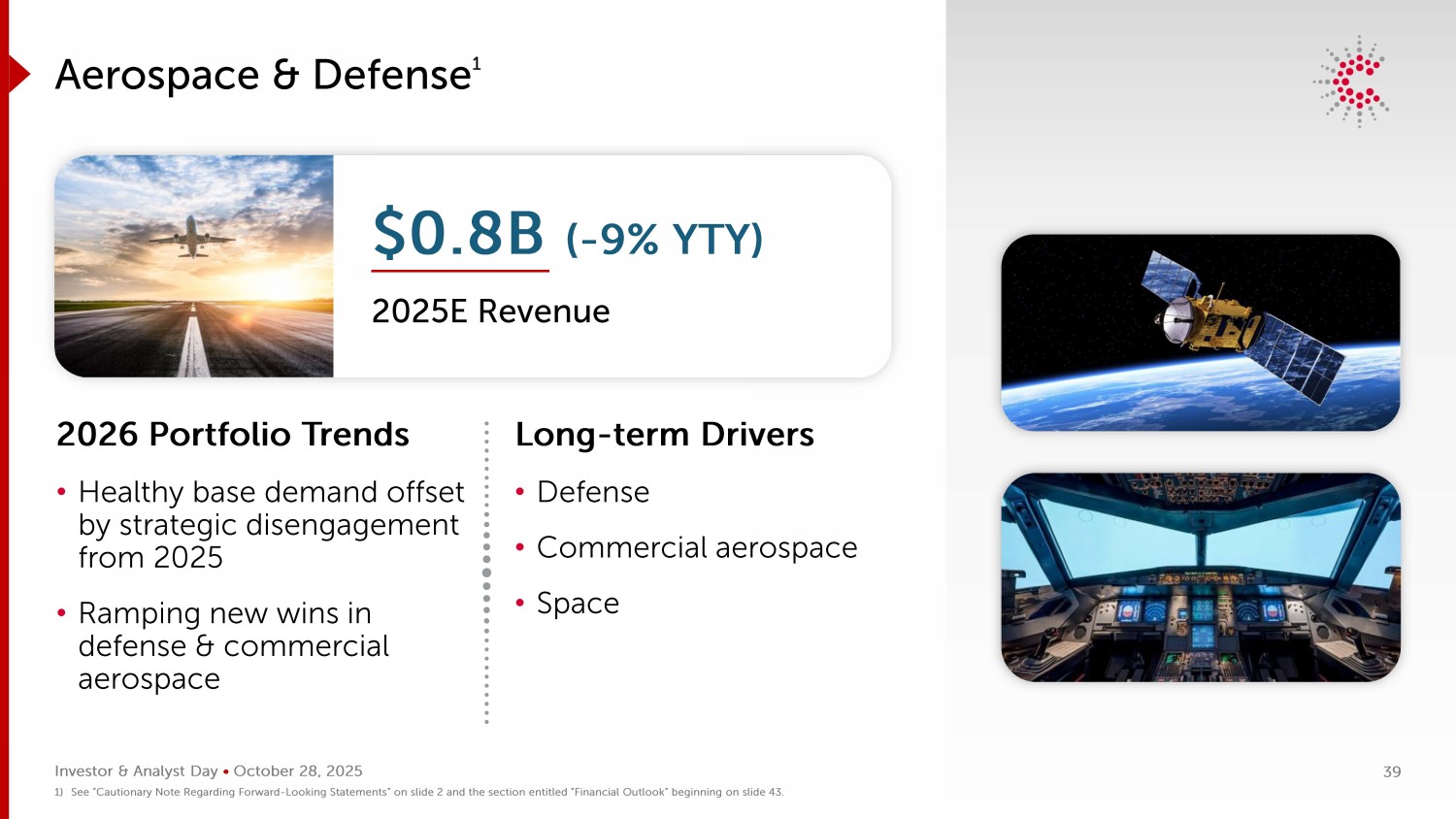 Investor & Analyst Day • 2025年10月28日Aerospace & Defense 12026投资组合趋势•健康的基础需求被2025年起的战略脱离接触所抵消•在国防和商业航空航天领域取得新的胜利长期驱动因素•国防•商业航空航天•太空$ 0.8B(-9% YTY)2025E收入1)请参阅幻灯片2上的“关于前瞻性陈述的注意事项”和幻灯片43开始的标题为“财务展望”的部分。39