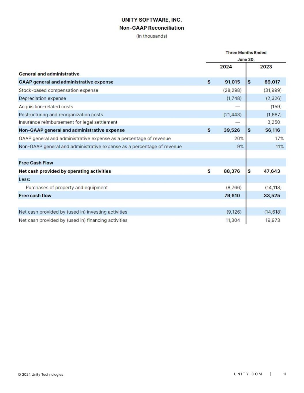U N I T Y. C O M | © 2024 Unity Technologies 9附录r我们将调整后EBITDA定义为GAAP净收入或亏损,不包括与基于股票的薪酬、所购无形资产的摊销、折旧、收购、重组和重组、法律费用的保险补偿、利息、所得税和其他非经营活动相关的利益或费用,这些主要包括汇率损益。我们将调整后EBITDA利润率定义为调整后EBITDA占收入的百分比。我们将调整后的毛利润定义为GAAP毛利润,不包括与基于股票的薪酬、收购的无形资产摊销、折旧以及重组和重组相关的费用。我们将调整后的毛利率定义为调整后的毛利润占收入的百分比。我们将非GAAP研发费用定义为研发费用,不包括与基于股票的薪酬、收购的无形资产摊销、折旧以及重组和重组相关的费用。我们将非GAAP销售和营销费用定义为GAAP销售和营销费用,不包括与基于股票的薪酬、收购的无形资产摊销、折旧以及重组和重组相关的费用。我们将非GAAP一般和管理费用定义为一般和管理费用,不包括与基于股票的补偿、折旧、收购、重组和重组以及法律费用的保险报销相关的费用。我们将自由现金流定义为经营活动提供的现金净额减去用于购买物业和设备的现金。