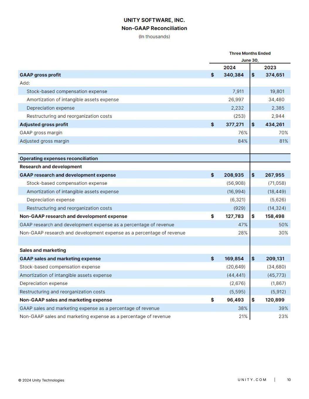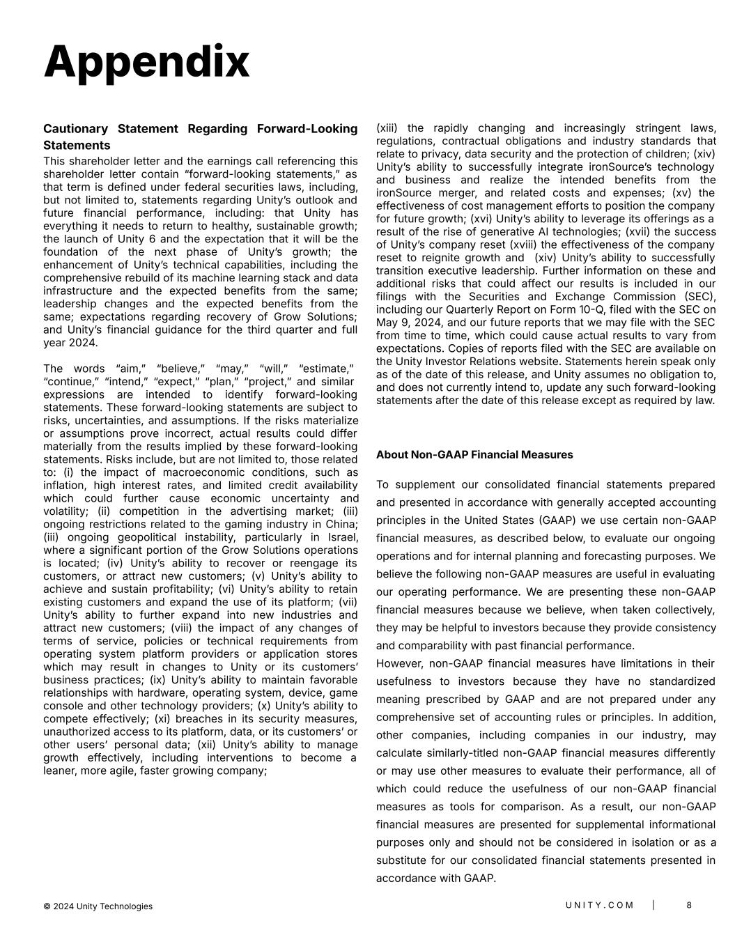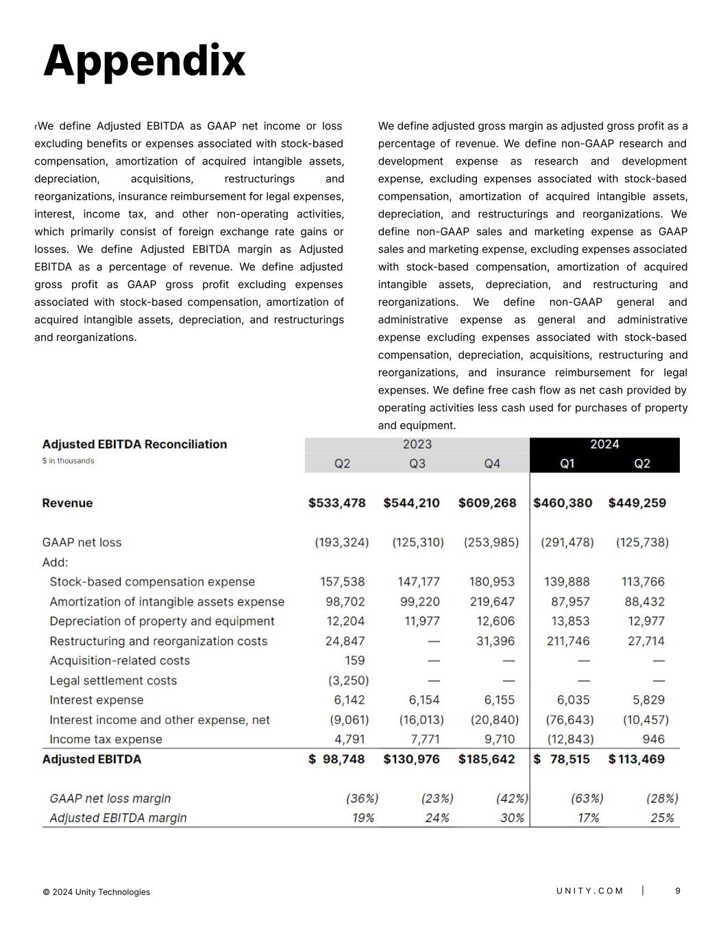 U N I T Y.C O M | © 2024 Unity Technologies 8关于前瞻性陈述的附录警示性声明这封股东信和引用这封股东信的财报电话会议包含“前瞻性陈述,丨因为该术语是根据联邦证券法定义的,包括但不限于关于Unity前景和未来财务业绩的声明,包括:Unity拥有恢复健康、可持续增长所需的一切;Unity 6的推出以及对它将成为Unity下一阶段增长基础的期望;Unity技术能力的增强,包括全面重建其机器学习堆栈和数据基础设施及其预期收益;领导层变动及其预期收益;有关Grow Solutions复苏的预期;以及Unity对2024年第三季度和全年的财务指导。“aim、TERM1believe、丨“may”、丨“will”、丨“estimate”、丨“continue”、丨“intend”、丨“expect”、丨“plan”、丨“project”等词语及类似表述旨在识别前瞻性陈述。这些前瞻性陈述受风险、不确定性和假设的影响。如果风险成为现实或假设被证明不正确,实际结果可能与这些前瞻性陈述所暗示的结果存在重大差异。风险包括但不限于与以下相关的风险:(i)宏观经济条件的影响,例如通货膨胀、高利率和有限的信贷供应,这可能进一步造成经济不确定性和波动;(ii)广告市场的竞争;(iii)与中国博彩业相关的持续限制;(iii)持续的地缘政治不稳定,特别是在以色列,Grow Solutions业务的很大一部分都位于那里;(iv)Unity恢复或重新吸引客户的能力,或吸引新客户;(v)Unity实现和持续盈利的能力;(vi)Unity留住现有客户和扩大其平台使用范围的能力;(vii)Unity进一步拓展新行业和吸引新客户的能力;(viii)操作系统平台提供商或应用程序商店的服务条款、政策或技术要求的任何变化可能导致Unity或其客户的商业惯例发生变化的影响;(ix)Unity与硬件、操作系统、设备、游戏机和其他技术提供商;(x)Unity的有效竞争能力;(xi)其安全措施遭到破坏,未经授权访问其平台、数据或其客户或其他用户的个人数据;(xii)Unity有效管理增长的能力,包括为成为一家更精简、更敏捷、增长更快的公司而进行的干预;(xiii)与隐私、数据安全和保护儿童相关的快速变化和日益严格的法律、法规、合同义务和行业标准;(xiv)Unity成功整合IronSource的技术和业务并从ironSource合并中实现预期收益的能力,以及相关成本和费用;(xv)成本管理努力为公司未来增长定位的有效性;(xvi)Unity由于生成性AI技术的兴起而利用其产品的能力;(xvii)Unity公司重置的成功(xviii)公司重置的有效性以重新点燃增长和(xiv)Unity成功过渡执行领导层的能力。关于这些和可能影响我们业绩的额外风险的更多信息包含在我们向美国证券交易委员会SEC提交的文件中,包括我们于2024年5月9日向SEC提交的Form 10 Q季度报告,以及我们可能不时向SEC提交的未来报告,这可能会导致实际结果与预期不同。向SEC提交的报告副本可在Unity投资者关系网站上查阅。本文的声明仅在本新闻稿发布之日发表,Unity不承担任何义务,目前也不打算在本新闻稿发布之日之后更新任何此类前瞻性声明,除非法律要求。关于非GAAP财务指标,以补充我们根据美国公认会计原则编制和呈报的合并财务报表GAAP)我们使用某些非GAAP财务指标,如下所述,以评估我们的持续运营并用于内部规划和预测目的。我们认为,以下非GAAP衡量标准有助于评估我们的经营业绩。我们提出这些非公认会计准则财务指标是因为我们认为,当集中采取时,它们可能对投资者有所帮助,因为它们提供了与过去财务业绩的一致性和可比性。然而, 非GAAP财务指标对投资者的有用性存在局限性,因为它们没有GAAP规定的标准化含义,也不是根据任何一套全面的会计规则或原则编制的。此外,其他公司,包括我们行业的公司,可能会以不同的方式计算类似标题的非GAAP财务指标,或者可能使用其他指标来评估其业绩,所有这些都可能降低我们的非GAAP财务指标作为比较工具的有用性。因此,我们的非GAAP财务指标仅用于补充信息目的,不应孤立地考虑或替代我们根据GAAP提交的合并财务报表。