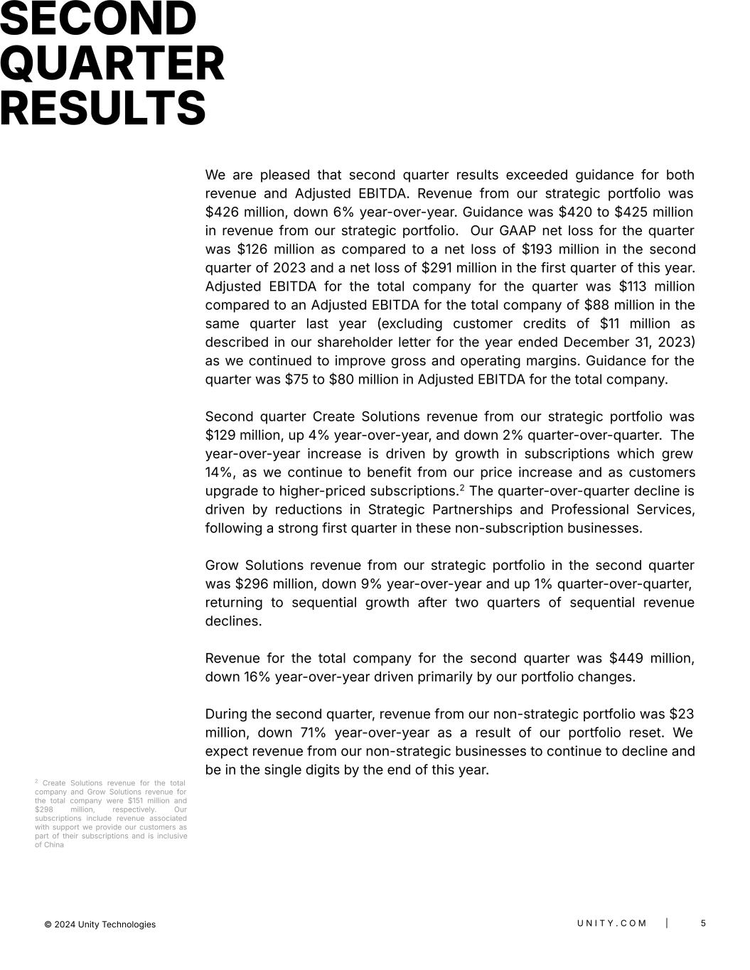 U N I T Y. C O M | © 2024 Unity Technologies 5第二季度业绩我们很高兴第二季度业绩超过了收入和调整后EBITDA的指引。我们战略投资组合的收入为4.26亿美元,同比下降6%。我们的战略投资组合的收入指引为420至4.25亿美元。我们本季度的GAAP净亏损为1.26亿美元,而2023年第二季度的净亏损为1.93亿美元,今年第一季度的净亏损为2.91亿美元。本季度公司整体的调整后EBITDA为1.13亿美元,而去年同季度公司整体的调整后EBITDA为8800万美元(不包括我们在截至2023年12月31日止年度的股东信中所述的1100万美元的客户信贷,因为我们继续提高毛利率和营业利润率。本季度的指引是,整个公司的调整后EBITDA为7500万至8000万美元。第二季度Create Solutions来自我们战略投资组合的收入为1.29亿美元,同比增长4%,环比下降2%。同比增长是由增长14%的订阅增长推动的,因为我们继续受益于我们的价格上涨,并且随着客户升级到更高价格的订阅。2环比下降是由战略合作伙伴关系和专业服务的减少推动的,此前这些非订阅业务在第一季度表现强劲。Grow Solutions第二季度来自我们战略投资组合的收入为2.96亿美元,同比下降9%,环比增长1%,在连续两个季度的收入下降之后恢复了连续增长。该公司第二季度总收入为4.49亿美元,同比下降16%,这主要是由于我们的投资组合变化。在第二季度,由于我们的投资组合重置,我们非战略性投资组合的收入为2300万美元,同比下降71%。我们预计非战略业务的收入将继续下降,到今年年底将处于个位数。2 Create Solutions公司总收入和Grow Solutions公司总收入分别为1.51亿美元和2.98亿美元。我们的订阅包括与我们作为客户订阅的一部分向客户提供的支持相关的收入,包括中国