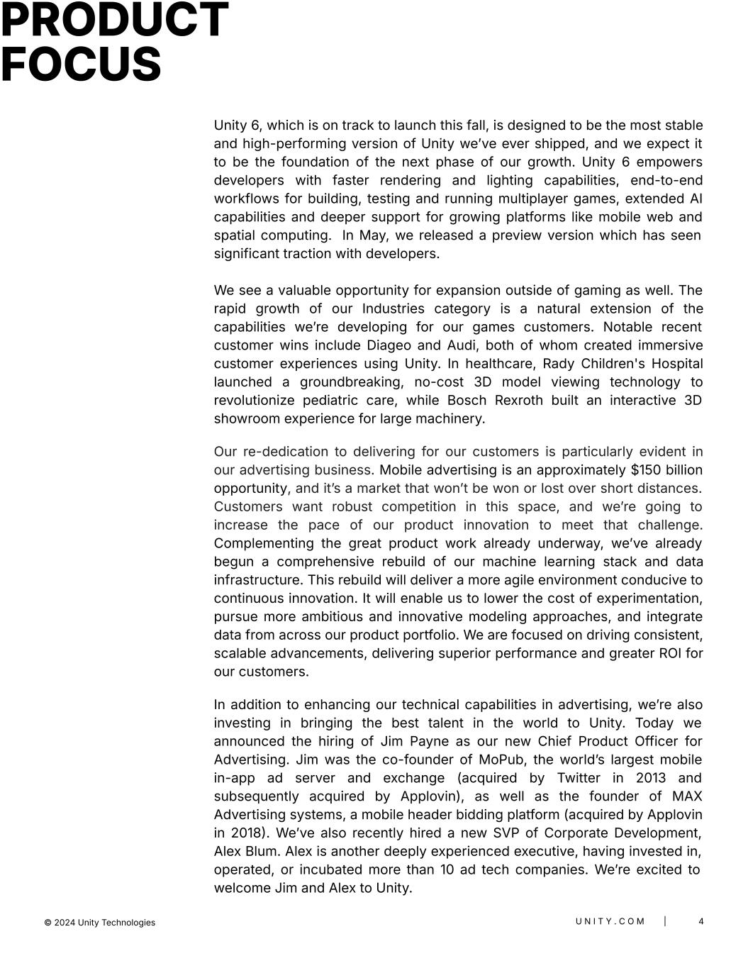 U N I T Y. C O M | © 2024 Unity Technologies 4 Unity 6有望于今年秋季推出,它被设计为我们有史以来出货的最稳定和高性能的Unity版本,我们预计它将成为我们下一阶段增长的基础。Unity 6为开发人员提供了更快的渲染和照明能力、用于构建、测试和运行多人游戏的端到端工作流程、扩展的AI能力以及对移动Web和空间计算等不断增长的平台的更深入支持。今年5月,我们发布了一个预览版,该版本在开发人员中获得了显着的吸引力。我们也看到了在游戏之外进行扩张的宝贵机会。我们工业类别的快速增长是我们为游戏客户开发的能力的自然延伸。最近赢得客户的值得注意的包括帝亚吉欧和奥迪,这两家公司都使用Unity创造了沉浸式客户体验。在医疗保健领域,雷迪儿童医院推出了一项开创性的、免费的3D模型观看技术,以彻底改变儿科护理,而博世力士乐则为大型机械构建了交互式3D展厅体验。我们重新致力于为客户提供服务,这在我们的广告业务中表现得尤为明显。移动广告是一个大约1500亿美元的机会,这是一个不会因短距离而得失的市场。客户希望在这个领域有强劲的竞争,我们将加快产品创新的步伐以应对这一挑战。作为对已经在进行的伟大产品工作的补充,我们已经开始全面重建我们的机器学习堆栈和数据基础设施。这种重建将提供一个更敏捷的环境,有利于持续创新。它将使我们能够降低实验成本,追求更雄心勃勃和创新的建模方法,并整合来自我们产品组合的数据。我们专注于推动一致的、可扩展的进步,为我们的客户提供卓越的性能和更高的投资回报率。除了增强我们在广告方面的技术能力,我们还在投资将世界上最优秀的人才带到Unity。今天,我们宣布聘请Jim Payne担任我们新的广告首席产品官。Jim是全球最大的移动应用内广告服务器和交易所MoPub(2013年被Twitter收购,随后被Applovin收购)的联合创始人,也是移动头竞价平台MAX Advertising System(2018年被Applovin收购)的创始人。我们最近还聘请了新的企业发展高级副总裁Alex Blum。Alex是另一位经验丰富的高管,曾投资、运营或孵化过10多家广告科技公司。我们很高兴欢迎Jim和Alex加入Unity。产品重点