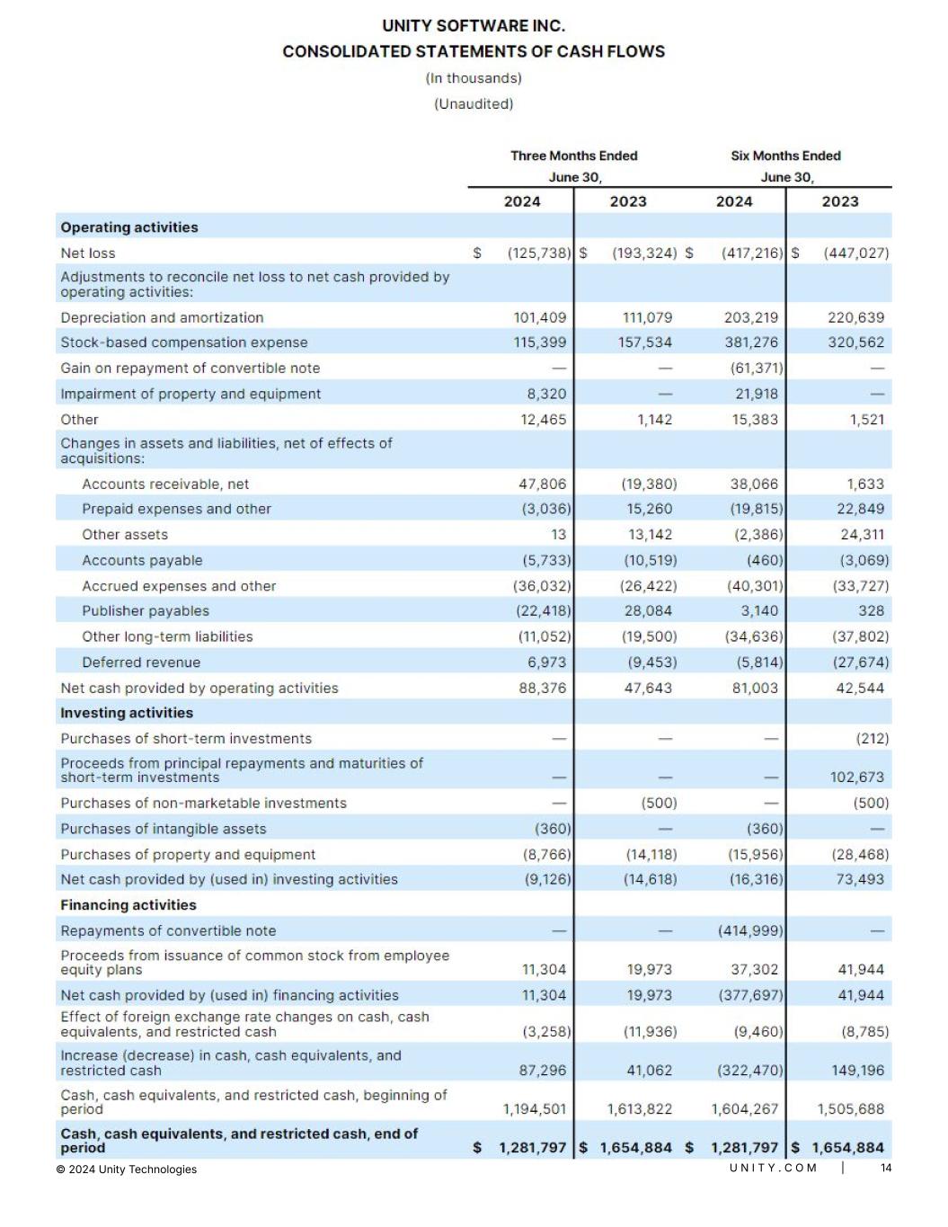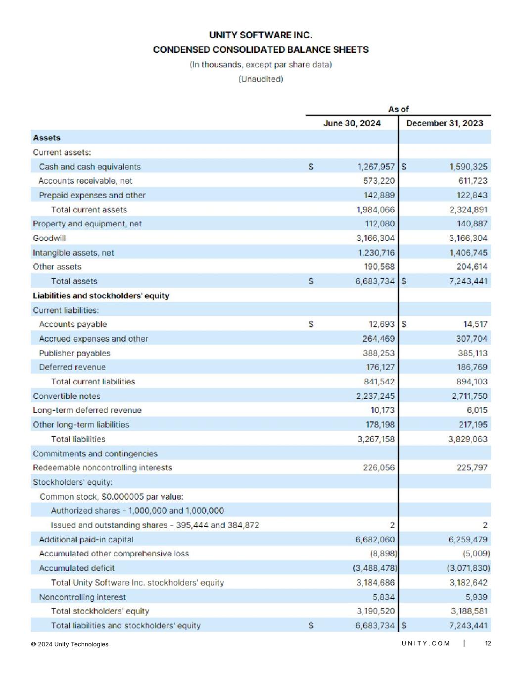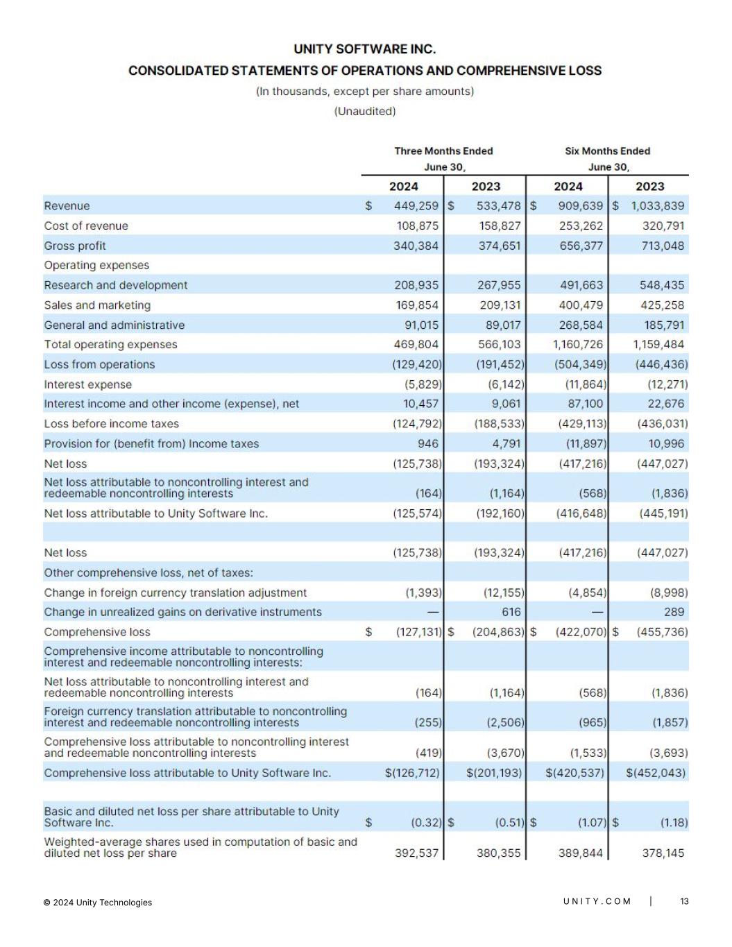 U N I T Y. C O M | © 2024 Unity Technologies 6第三季度,我们将战略投资组合的收入指引为4.15至4.2亿美元,同比下降4%至6%。我们将整个公司的调整后EBITDA引导至75至8000万美元。对于全年,我们正在调整我们的指导方针。我们战略投资组合的新收入指引为1,680至1,690百万美元,此前为1,760至1,800百万美元。同比下降2%至3%。指引的下调代表了我们对Grow Solutions业务复苏采取的更加谨慎的态度,在该业务中,对基本产品增强的投资将需要一段时间才能体现出可持续的业绩增长。在Create中,我们预计下半年的收入增长将主要来自游戏订阅和行业的持续增长。我们新的调整后EBITDA指引为340至3.5亿美元,而之前的指引为400至4.25亿美元。预期调整后EBITDA较低主要是由于预计收入较低,部分被增量成本节约所抵消。我们认为,随着时间的推移,通过更有纪律的执行可以获得更大的效率。我们在第二季度结束时的完全稀释后的股票数量为4.765亿股,而我们在第二季度的指导下的完全稀释后的股票数量为4.78亿股。我们预计第三和第四季度末完全稀释后的股份为4.88亿股。这比我们之前的年终估计的4.92亿有所减少。因此,我们的净同比稀释将在2%左右。指南33这些陈述具有前瞻性,实际结果可能存在重大差异。有关可能导致我们的实际结果与这些前瞻性陈述存在重大差异的因素的信息,请参阅下面的“关于前瞻性陈述的警示性声明丨安全港部分。由于未来可能发生的费用的不确定性和潜在可变性,我们没有将我们对非GAAP财务指标的估计与GAAP进行核对。因此,没有不合理的努力就无法实现和解,我们无法解决无法获得的信息的可能重要性。我们在这封股东信中包含的第二季度和2024年全年非公认会计原则业绩的财务报表表格中提供了其他公认会计原则与非公认会计原则财务指标的对账。