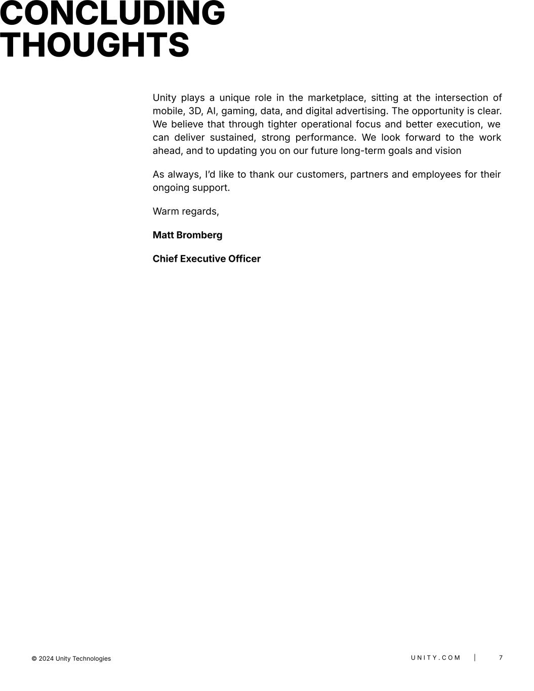 U N I T Y. C O M | © 2024 Unity Technologies Dear UNITY Shareholders很荣幸作为首席执行官首次向Unity的股东发表讲话。自5月份加入公司以来,我有机会参观了我们在世界各地的团队并向他们学习,并享受了与我们的客户和社区建立联系的时间。今天,我对我们的潜力甚至比我开始的那一天还要乐观。这种乐观建立在10多年来与世界上一些最好的游戏团队合作的基础上,在每个类型中进行构建,使用5个不同的引擎,并在每个平台上发布。我还负责帮助这些游戏找到全球观众,并作为直播服务建立可持续增长。我完全有信心地告诉你,我们拥有让Unity恢复健康、可持续增长所需的一切。现在的重点是培养执行力、纪律性、问责性的文化。我们计划加快产品创新的步伐,加强我们与客户和社区的联系,并为团队增加世界级的人才。我们了解需要改进的地方,我们正以真正的紧迫感对我们的领导层、产品和流程进行必要的变革。Unity建立在二十年深厚的客户关系和对解决难题的热爱之上,为比2019年大22%的移动游戏市场提供了至关重要的工具和技术。移动游戏占每年约1300亿美元的消费者应用支出的60%,世界上70%的顶级移动游戏都建立在Unity之上。2023年,使用Unity制作的应用程序平均每月有37亿次下载。1在业务的广告端,我们每月交付超过650亿次展示,覆盖超过15亿个人游戏玩家。我们相信,这种规模和广度让我们相信,Unity是数字游戏生态系统的核心。我们相信,凭借更好的执行力,这些市场的规模和活力将使Unity能够与游戏和科技行业中表现最好的公司一起赢得一席之地。。21月均下载量是根据data.ai数据得出的34.4亿次移动端下载的综合数字,加上根据Steam数据得出的2.71亿次内部估计的下载量。基于截至2023年12月31日止12个月。