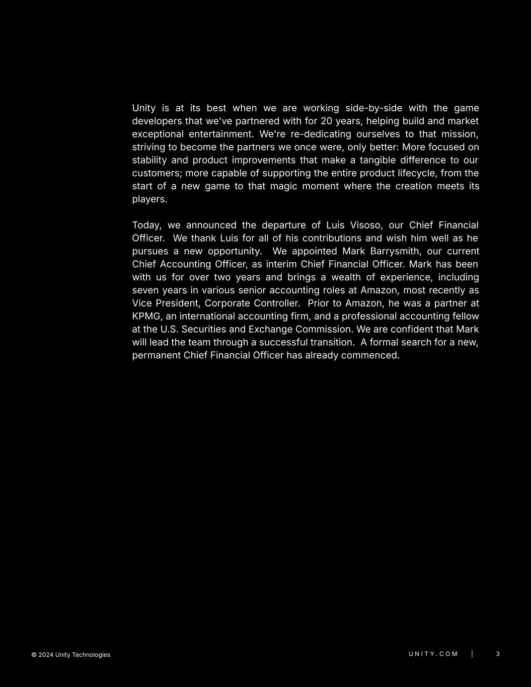 U N I T Y. C O M | © 2024 Unity Technologies Unity与我们合作了20年的游戏开发商并肩合作,帮助构建和营销非凡的娱乐,这是我们处于最佳状态的时候。我们正在重新致力于那个使命,努力成为我们曾经的合作伙伴,只会更好:更专注于稳定性和产品改进,为我们的客户带来实实在在的改变;更有能力支持整个产品生命周期,从新游戏的开始到创造与玩家相遇的神奇时刻。今天,我们宣布了我们的首席财务官 Luis Visoso的离职。我们感谢路易斯的所有贡献,并祝愿他在追求新机遇的过程中一切顺利。我们任命现任首席财务官 Mark Barrysmith为临时首席财务官。马克在我们这里工作了两年多,带来了丰富的经验,包括在亚马逊担任过七年的各种高级会计职务,最近担任副总裁、公司财务总监。在加入亚马逊之前,他是国际会计师事务所毕马威的合伙人,也是美国证券交易委员会的专业会计研究员。我们有信心,马克将带领球队完成一次成功的过渡。正式物色新的常任首席财务官的工作已经开始。3