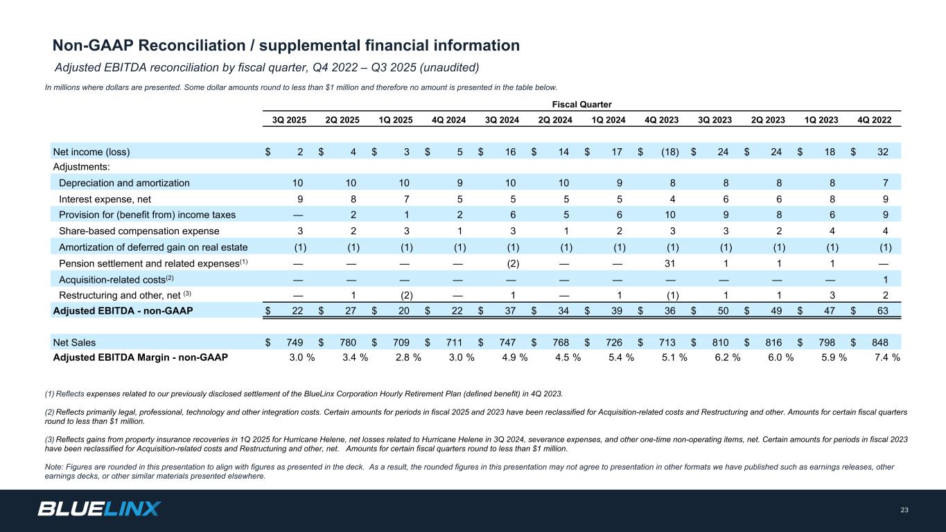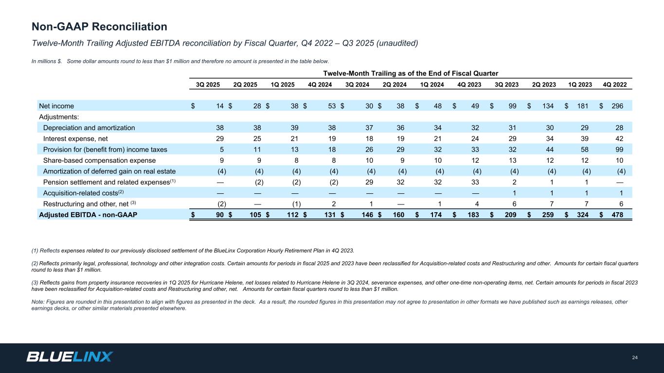 按财政季度调整的EBITDA调节,2022年第四季度– 2025年第三季度(未经审计),单位:百万美元,其中列报。有些美元的金额约为不到100万美元,因此下表中没有列出任何金额。23(1)反映了与我们之前披露的2023年第四季度BlueLinx Corporation小时退休计划(固定福利)结算相关的费用。(2)主要反映法律、专业、技术等整合成本。2025和2023财年期间的某些金额已重新分类为与收购相关的成本和重组及其他。某些财政季度的金额接近100万美元以下。(3)反映飓风Helene在2025年第一季度的财产保险恢复收益、2024年第三季度与飓风Helene相关的净损失、遣散费以及其他一次性非经营项目的净额。2023财年期间的某些金额已重新分类为收购相关成本和重组及其他净额。某些财政季度的金额接近100万美元以下。注:本演示文稿中的数字是四舍五入的,以与甲板中的数字保持一致。因此,本演示文稿中的四舍五入数字可能不同意以我们发布的其他格式进行演示,例如收益发布、其他收益套牌或其他地方演示的其他类似材料。财政季度2025年第三季度2025年第二季度2025年第一季度2025年第四季度2024年第三季度2024年第二季度2024年第一季度2024年第四季度2023年第三季度2023年第二季度2023年第一季度2022年第四季度净收入(亏损)$ 2 $ 4 $ 3 $ 5 $ 16 $ 14 $ 17 $(18)$ 24 $ 24 $ 18 $ 32调整:折旧和摊销10101098887利息支出,净额987555546689所得税(受益)准备— 212656109869股权激励费用323131233244不动产递延收益摊销(1)(1)(1)(1)(1)(1)(1)(1)(1)(1)(1)(1)(1)(1))养老金结算及相关费用(1)———— 31111 —收购相关费用(2)—————————————— 1重组及其他,净额(3)— 1(2)— 1 — 1(1)1132调整后EBITDA-非美国通用会计准则22美元27美元20美元22美元37美元34美元39美元36美元50美元49美元47美元63美元净销售额749美元780美元709美元711美元747美元768美元726美元713美元810美元816美元798美元848美元调整后EBITDA利润率-非美国通用会计准则3.0% 3.4% 2.8% 3.0% 4.9% 4.5% 5.4% 5.1% 6.2% 6.0% 5.9% 7.4%非美国通用会计准则调节/补充财务信息
