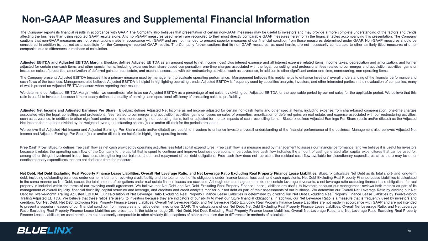 该公司根据公认会计原则报告其财务业绩。该公司还认为,提出某些非公认会计原则措施可能对投资者有用,并且可能比单独使用报告的公认会计原则结果更全面地了解影响业务的因素和趋势。本文中使用的任何非GAAP衡量标准都与本文中或本演示文稿随附的财务表格中最直接可比的GAAP衡量标准进行了核对。该公司告诫说,非GAAP衡量标准不是根据GAAP做出的陈述,也不是为了从根据GAAP确定的那些衡量标准中呈现我们财务状况的优越衡量标准。非GAAP措施应被视为公司报告的GAAP结果的补充,而不是替代。该公司进一步警告称,由于计算方法的差异,其此处使用的非GAAP衡量标准不一定与其他公司的其他类似名称的衡量标准具有可比性。调整后EBITDA和调整后EBITDA利润率。BlueLinx将调整后EBITDA定义为等于净收入(亏损)加上利息费用和所有利息费用相关项目、所得税、折旧和摊销的金额,并进一步调整了某些非现金项目和其他特殊项目,包括来自股份补偿的费用、与我们的并购活动相关的法律、咨询和专业费用相关的一次性费用、出售物业的损益、房地产递延收益的摊销以及与我们的重组活动相关的费用,例如遣散费,以及其他重大和/或一次性、非经常性、非经营性项目。公司提出调整后EBITDA是因为它是管理层用来评估经营业绩的主要衡量标准。管理层认为,这一指标有助于增强投资者对企业财务业绩和现金流的整体理解。管理层还认为,调整后的EBITDA有助于突出经营趋势。调整后的EBITDA经常被证券分析师、投资者和其他感兴趣的各方用于评估公司,其中许多公司在报告业绩时提出了调整后的EBITDA衡量标准。我们通过将适用期间的调整后EBITDA除以适用期间的净销售额来确定我们的调整后EBITDA利润率,我们有时将其称为调整后EBITDA占净销售额的百分比。我们认为,这一比率对投资者是有用的,因为它更清楚地定义了将销售转化为盈利的收益质量和运营效率。调整后的净收入和调整后的每股收益。BlueLinx将调整后的净收入定义为对某些非现金项目和其他特殊项目进行调整的净收入,包括来自股份薪酬的费用、与我们的并购活动相关的法律、咨询和专业费用相关的一次性费用、出售物业的损益、房地产递延收益的摊销,以及与我们的重组活动相关的费用,例如遣散费,此外还有其他重大和/或一次性、非经常性、非经营性项目,并进一步针对此类调节项目的税收影响进行了调整。BlueLinx将调整后每股收益(基本和/或稀释)定义为该期间的调整后净收入除以所示期间的加权平均流通股(基本和/或稀释)。我们认为,调整后的净收入和调整后的每股收益(基本和/或稀释)有助于投资者增强投资者对业务财务表现的整体理解。管理层还认为,调整后的净收入和调整后的每股收益(基本和/或稀释后)有助于突出经营趋势。自由现金流。BlueLinx将自由现金流定义为经营活动提供的净现金减去总资本支出。自由现金流是管理层用来评估我们财务业绩的一种衡量标准,我们认为它对投资者有用,因为它将公司的经营现金流与用于持续和改善业务运营的资本联系起来。特别是,自由现金流表示资本支出后产生的现金数量,可用于(其中包括)投资我们的业务、加强我们的资产负债表以及偿还我们的债务。自由现金流不代表可用于可自由支配支出的剩余现金流,因为可能还有其他非可自由支配支出未从该计量中扣除。净负债、不含不动产融资租赁负债的净负债、整体净杠杆率、不含不动产融资租赁负债的净杠杆率。BlueLinx将净债务计算为其短期和长期债务总额, 包括我们定期贷款和循环信贷额度下的未偿余额以及其在融资租赁下的债务总额,减去现金和现金等价物。不包括不动产融资租赁负债的净债务按照与净债务相同的方式计算,但不包括不动产融资租赁项下的债务总额。尽管我们的信贷协议不包含杠杆契约,但我们的循环信贷协议条款中包含了不包括不动产融资租赁义务的净杠杆比率。我们认为,净债务和不包括不动产融资租赁负债的净债务对投资者是有用的,因为我们的管理层审查这两个指标,作为其对整体流动性、财务灵活性、资本结构和杠杆的管理的一部分,债权人和信用分析师监测我们的净债务,作为他们对我们业务评估的一部分。我们通过将净债务除以12个月的尾随调整后EBITDA来确定我们的总体净杠杆率。我们对不包括不动产融资租赁负债的净杠杆率的计算是通过将不包括不动产融资租赁负债的净债务除以12个月的尾随调整后EBITDA确定的。我们认为,这些比率对投资者有用,因为它们是我们履行未来财务义务能力的指标。此外,我们的净杠杆率是投资者和债权人经常使用的衡量标准。我们的净债务、不包括不动产融资租赁负债的净债务、总体净杠杆率和不包括不动产融资租赁负债的净杠杆率不是根据公认会计原则制定的,也不是为了从根据公认会计原则确定的衡量标准和比率中更好地衡量我们的财务状况。我们的净负债、不含不动产融资租赁负债的净负债、整体净杠杆率、不含不动产融资租赁负债的净杠杆率计算见第25页表格。净负债、不包括不动产融资租赁负债的净负债、整体净杠杆率、不包括不动产融资租赁负债的净杠杆率,如本文所用,由于计算方法的差异,不一定与其他公司的其他类似标题标题的标题具有可比性。18项非公认会计原则措施和补充财务