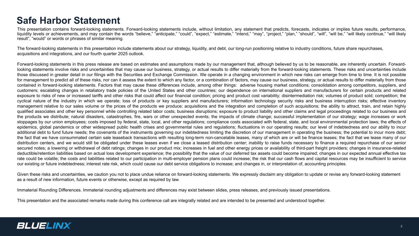 BlueLinx 2025年第三季度业绩交付重要事项2025年11月5日©BlueLinx 2025。版权所有。1展览99.2
