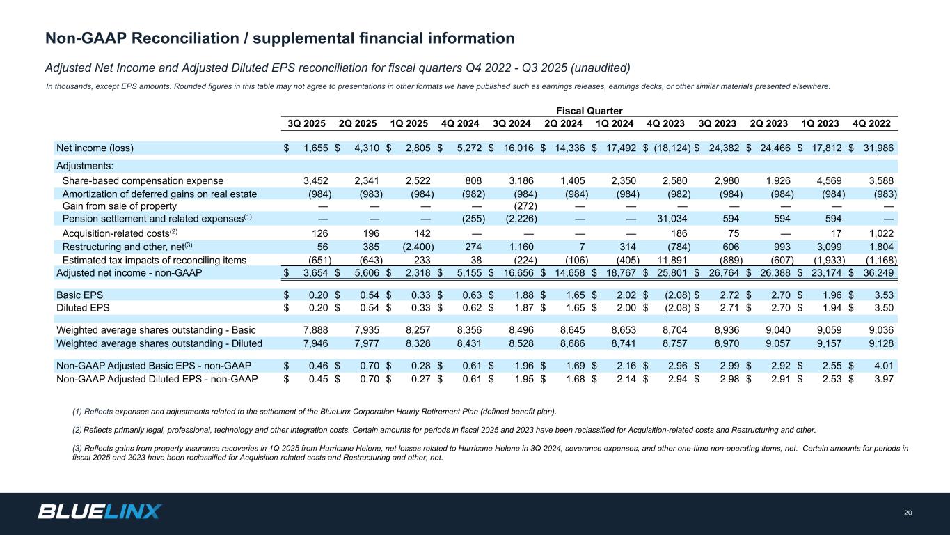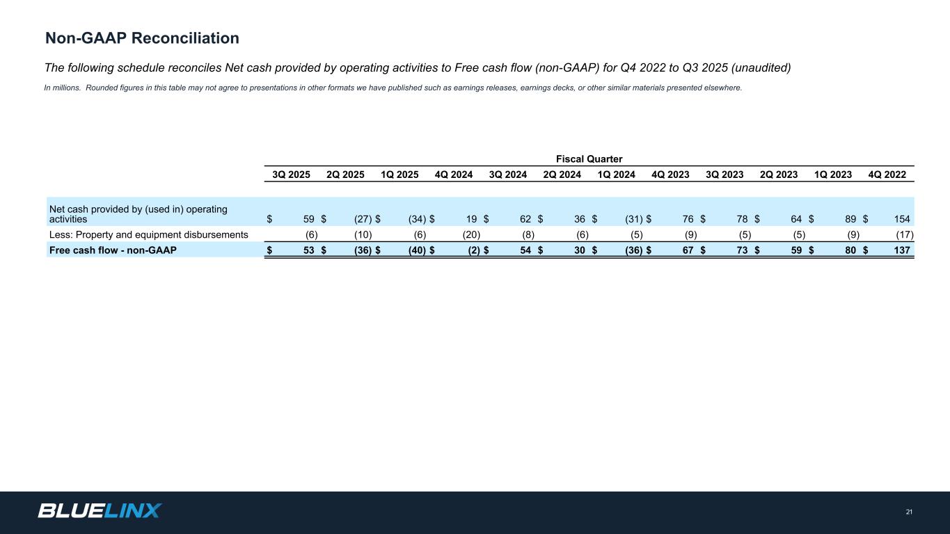2022年第四季度至2025年第三季度(未经审计)财政季度的调整后净收入和调整后稀释后每股收益对账以千为单位,每股收益金额除外。本表中的四舍五入数字可能不同意我们发布的其他格式的演示,例如收益发布、收益套牌或其他地方展示的其他类似材料。20非GAAP调节/补充财务信息(1)反映与BlueLinx Corporation小时退休计划(固定福利计划)结算相关的费用和调整。(2)主要反映法律、专业、技术等整合成本。2025和2023财年期间的某些金额已重新分类为与收购相关的成本和重组及其他。(3)反映2025年第一季度因飓风Helene而获得的财产保险赔偿收益、2024年第三季度与飓风Helene相关的净损失、遣散费以及其他一次性非经营性项目的净额。2025和2023财年期间的某些金额已重新分类为收购相关成本和重组及其他净额。财政季度2025年第三季度2025年第二季度2025年第一季度2025年第四季度2024年第三季度2024年第二季度2024年第一季度2024年第四季度2023年第二季度2023年第一季度2023年第四季度2022年净收入(亏损)1,655美元4,310美元2,805美元5,272美元16,016美元14,336美元17,492美元(18,124)24,382美元24,466美元17,812美元31,986美元调整:股权报酬费用3,4522,3412,5228083,1861,4052,3502,5802,9801,9264,5693,588房地产递延收益摊销(984)(983)(984)(984)(982)(984)(984)(983)出售物业收益————(272——————养老金结算及相关费用(1)————(255)(2,226)—— 31,034594594594 —收购相关费用(2)126196142 ———— 18675 — 171,022重组及其他,净额(3)56385(2,400)2741,1607314(784)6069933,0991,804调节项目的估计税收影响(651)(643)23338(224)(106)(405)11,891(889)(607)(1,933)(1,168)调整后净收入-非公认会计原则3,654美元5,606美元2,318美元5,155美元16,656美元14,658美元18,767美元25,801美元26,764美元26,388美元23,174美元36,249基本每股收益0.20美元0.54美元0.33美元0.63美元1.88美元1.65美元2.02美元(2.08)2.72美元2.70美元1.96美元3.53摊薄后每股收益0.20美元0.54美元0.33$ 2.00 $(2.08)$ 2.71 $ 2.70 $ 1.94 $ 3.50加权平均已发行股份-基本7,8887,9358,2578,3568,4968,6458,6538,7048,9369,0409,0599,036加权平均已发行股份-稀释后7,9467,9778,3288,4318,5288,6868,7418,7578,9709,0579,1579,128非公认会计原则调整后基本每股收益-非公认会计原则0.46美元0.70美元0.28美元0.61美元1.96美元1.69美元2.16美元2.96美元2.99美元2.92美元2.55美元4.01美元非公认会计原则调整后稀释每股收益-非公认会计原则0.45美元0.70美元0.27美元0.61美元1.95美元1.68美元2。2.94 $ 2.98 $ 2.91 $ 2.53 $ 3.97