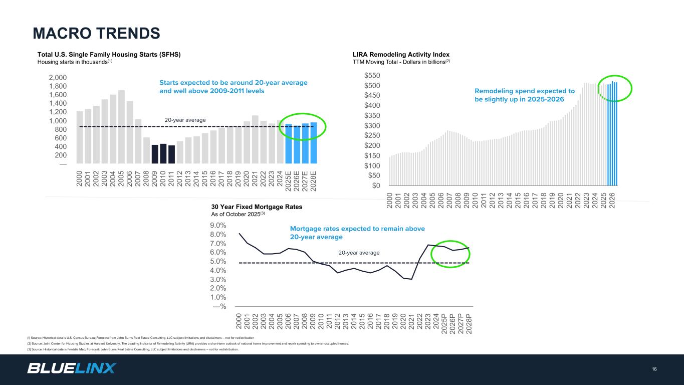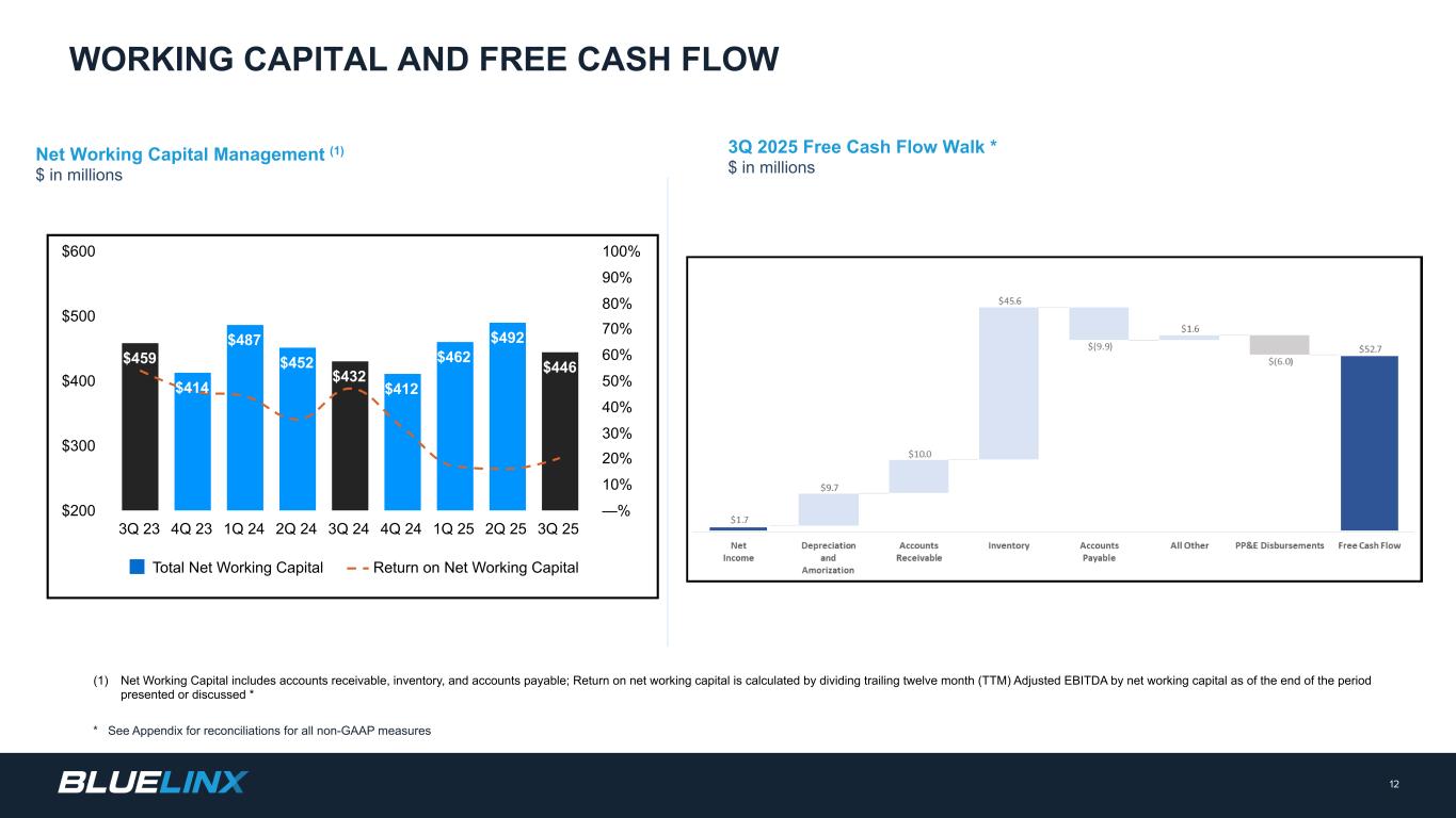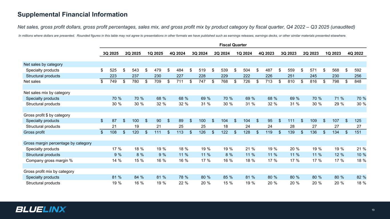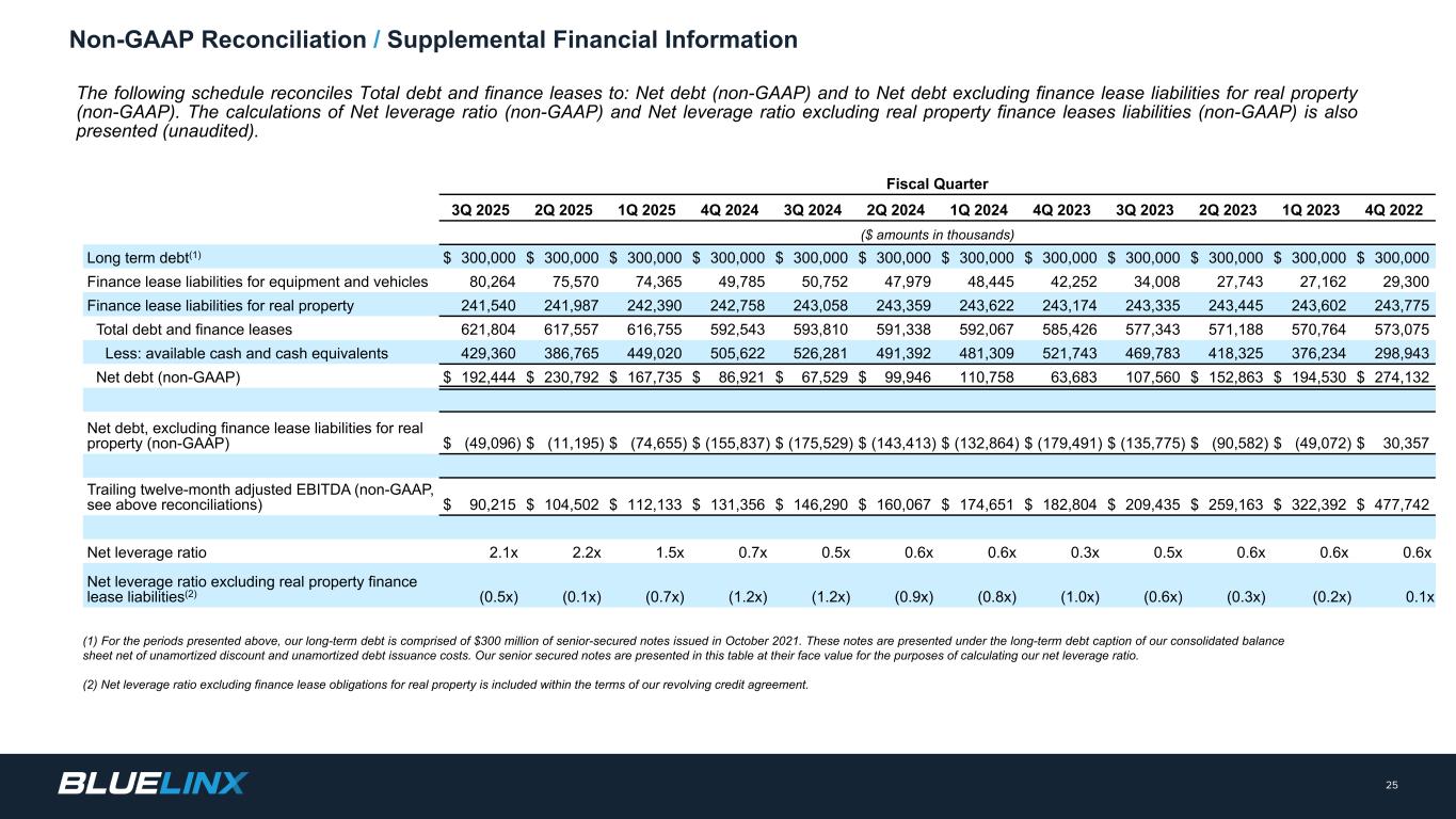 2022年第四季度至2025年第三季度按财政季度划分的12个月尾随调整后EBITDA对账(未经审计),单位:百万美元。有些美元的金额约为不到100万美元,因此下表中没有列出任何金额。24非美国通用会计准则对账(1)反映了与我们之前披露的2023年第四季度BlueLinx公司小时退休计划结算相关的费用。(2)主要反映法律、专业、技术等整合成本。2025和2023财年期间的某些金额已重新分类为与收购相关的成本和重组及其他。某些财政季度的金额大约在100万美元以下。(3)反映飓风Helene在2025年第一季度的财产保险恢复收益、2024年第三季度与飓风Helene相关的净损失、遣散费以及其他一次性非经营项目的净额。2023财年期间的某些金额已重新分类为收购相关成本和重组及其他净额。某些财政季度的金额接近100万美元以下。注:本演示文稿中的数字是四舍五入的,以与套牌中的数字保持一致。因此,本演示文稿中的四舍五入数字可能不同意以我们发布的其他格式进行演示,例如收益发布、其他收益套牌或其他地方演示的其他类似材料。截至财政季度末的12个月截至2025年第三季度2025年第二季度2025年第一季度2025年第四季度2024年第三季度2024年第二季度2024年第一季度2024年第四季度2023年第三季度2023年第二季度2023年第一季度2022年第四季度净收入14美元28美元38美元53美元30美元38美元48美元49美元99美元134美元134美元181美元296美元调整:折旧和摊销383839383736343231302928利息费用,净额292521191819212429343942所得税拨备(受益)51113182629323332445899股权激励费用9988 109101213121210不动产递延收益摊销(4)(4)(4)(4)(4)(4)(4)(4)(4)(4)(4)(4)(4)(4)养老金结算及相关费用(1)—(2)(2)29323233211 —收购相关费用(2)———————— 1111重组及其他,净额(3)(2)—(1)21 — 146776调整后EBITDA-非公认会计原则90美元105美元112美元131美元146美元160美元174美元183美元209美元259美元324美元478美元