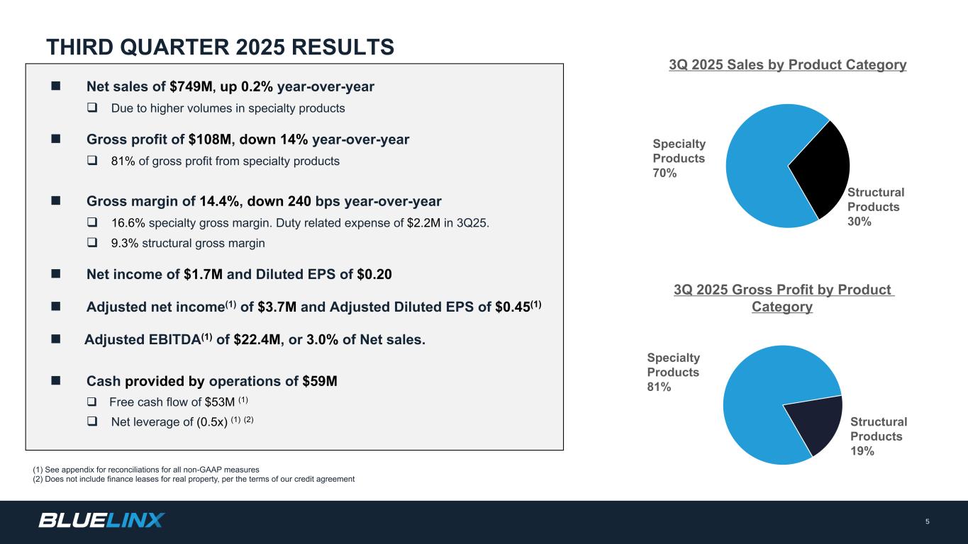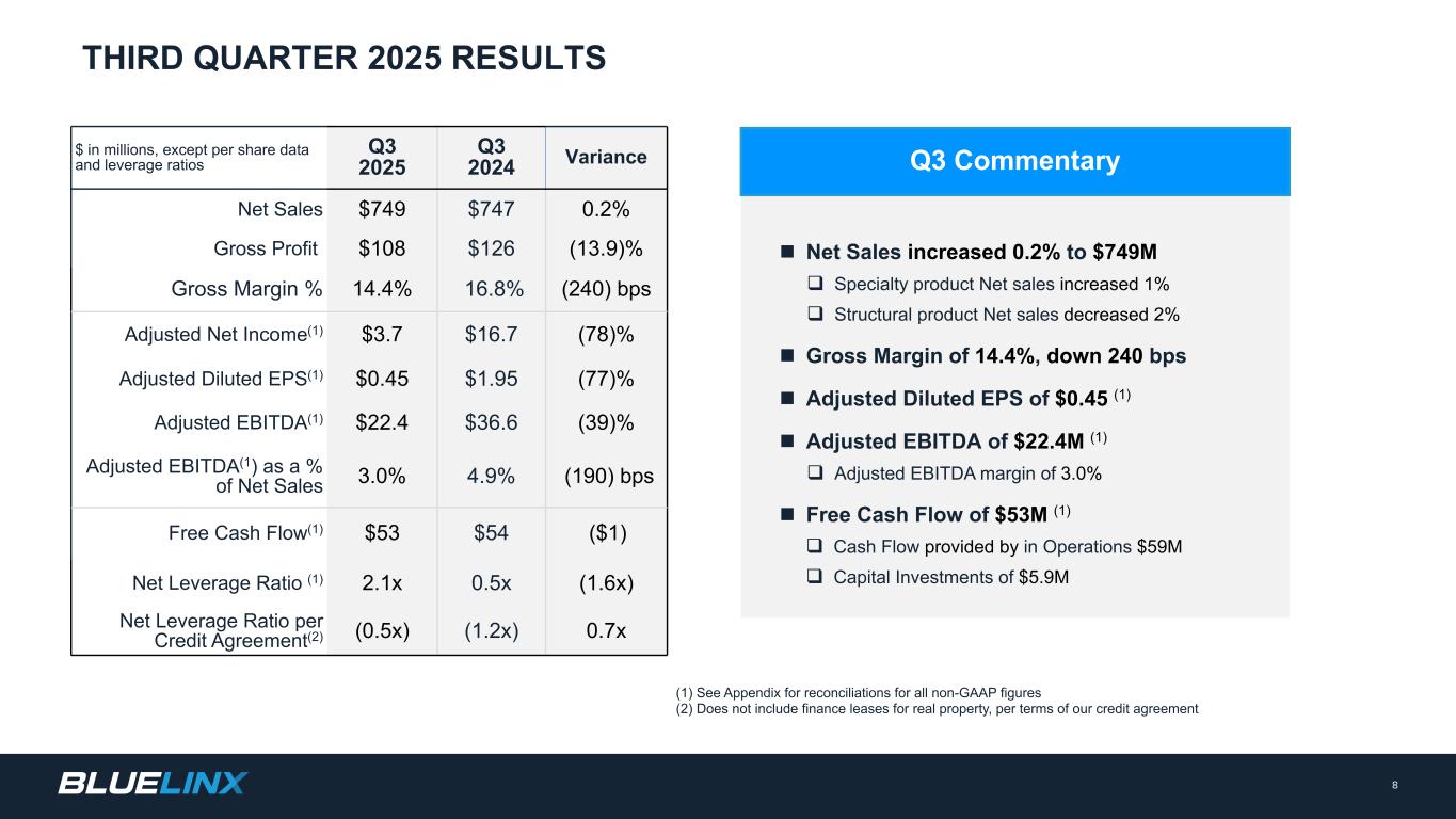 n净销售额增长0.2%至7.49亿美元q特种产品净销售额增长1% q结构性产品净销售额下降2% n毛利率为14.4%,下降240个基点n调整后摊薄后每股收益为0.45美元(1)n调整后EBITDA为2240万美元(1)q调整后EBITDA利润率为3.0% n自由现金流为5300万美元(1)q运营中提供的现金流5900万美元q资本投资为590万美元2025年第三季度业绩(1)所有非公认会计原则数字的调节见附录(2)不包括不动产的融资租赁,根据我们的信贷协议条款Q3评论百万美元,每股数据和杠杆比率除外Q3 2025 Q3 2024差异净销售额$ 749 $ 7470.2%毛利润$ 108 $ 126(13.9)%毛利率% 14.4% 16.8%(240)bps调整后净收入(1)$ 3.7 $ 16.7(78)%调整后稀释每股收益(1)$ 0.45 $ 1.95(77)%调整后EBITDA(1)$ 22.4 $ 36.6(39)%调整后EBITDA(1)占净销售额的百分比3.0% 4.9%(190)bps自由现金流(1)$ 53 $ 54($ 1)净杠杆率(1)2.1x 0.5x(1.6x)每份信贷协议净杠杆率(2)(0.5x)(1.2x)0.7x