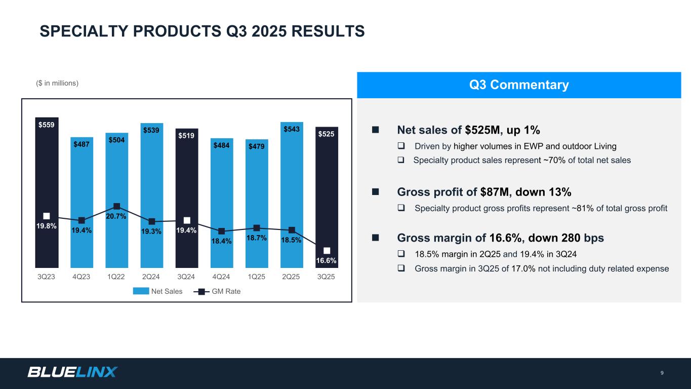 (单位:百万美元)n净销售额为5.25亿美元,环比增长1%,受EWP和户外生活q销量增加的推动特种产品销售额占总净销售额的约70% n毛利润为8700万美元,环比下降13% q特种产品毛利润占总毛利润的约81% n毛利率为16.6%,2Q25毛利率下降280个基点,2Q25为18.5%,2Q24为19.4% Q3毛利率为17.0%,不包括与关税相关的费用Q3评论9特种产品2025年Q3业绩$ 559 $ 487 $ 504 $ 539 $ 519 $ 484 $ 479 $ 543 $ 52519.8% 19.4% 20.7% 19.3% 19.4% 18.4% 18.7% 18.5% 16.6%净销售额GM率3Q23 4Q23 1Q22 2Q24 3Q24 4Q24 1Q25 2Q25 3Q25