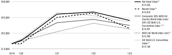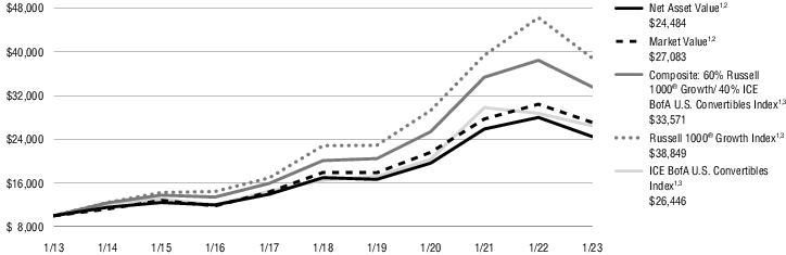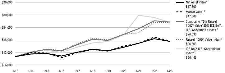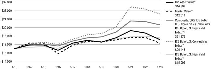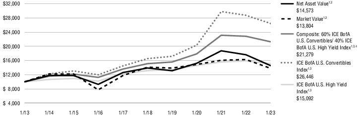 1过去的业绩并不代表未来的结果。目前的业绩可能低于或高于历史时期的业绩。2总市值回报率的计算假设在报告的每一期的第一天开盘时买入普通股,在最后一天收盘时卖出。为此计算的目的,假定股息和分配将按照基金自动再投资和现金购买计划获得的价格进行再投资。市场价值的总回报不会在不到一年的时间内按年计算。股东可能支付的经纪佣金没有反映出来。总市值回报率不反映股东可能为基金分配或出售基金份额所支付的税款的扣除。净资产价值总回报率使用相同的方法,但使用净资产价值作为期初和期末价值。3该指数没有管理,不能用于直接投资;因此,其业绩没有反映与积极管理实际投资组合有关的费用。有关指数和某些关键投资术语的信息,请参阅从第19页开始的关键投资术语。14 EQUITY & CONVERTIBLE INCOME FUND(NIE)MANAGER’S DISCUSSION OF FUND PERFORMANCE(Unaudited)January 31,2023 About the Fund:Equity & Convertible Income Fund(NYSE:NIE)(the“Fund”)的投资目标是寻求由资本增值、当期收入和收益组成的总回报。不能保证基金将实现其投资目标。哪些因素影响了基金在财年的表现?*截至2023年1月31日的财年,基金的资产净值(NAV)回报率为-12.54 %,市场价格回报率为-10.96 %。同期,基金的综合基准,包括60%的罗素1000指数®增长指数(代表股票)和40%的洲际银行美国可转换债券指数(代表可转换证券)的回报率为-12.69 %。基础指数的股票回报率为-16.02 %,可转换证券的回报率为-7.96 %。基金在截至2023年1月31日的12个月内实现了高水平的月收入。就业绩而言,这是一个充满挑战的时期,因为基金参与了风险资产的广泛抛售。对可转换证券的配置并没有提供多少下行保护。许多持股影响了2022年的业绩。对需求放缓和成本上升的担忧,在一定程度上导致了电动汽车制造、电子商务和消费电子产品的疲软。广告预算问题拖累了互联网服务和社交媒体曝光率。由于宏观经济风险,软件和半导体头寸的表现也不佳。积极的个人贡献者包括受益于原油价格上涨和流动性增加的能源相关公司。勘探与生产和油田服务持有量对业绩有显著影响,清洁能源敞口也是如此。防御性的医疗保健类股票,包括一家制药公司,是另一个强劲的来源。此外,许多书面期权头寸到期时的价格低于执行价格,养恤基金得以保留设定的溢价。*请参阅第2页,了解经理对市场表现的讨论。前面的信息是投资组合管理部门的意见,仅限于报告期末,如封面所述。任何此类意见随时可能根据市场情况而改变,不应作为投资建议。基金的投资组合可能会发生变化,可能无法代表投资组合经理当前或未来的投资决策。提及基金持有的个别证券仅供参考,不应被解释为购买或出售任何证券的建议。投资者如欲就投资于所讨论的任何证券或投资策略的适当性寻求财务建议,应咨询其财务专业人士。有关指数和某些关键投资术语的信息,请参阅从第19页开始的关键投资术语。15 EQUITY & CONVERTIBLE INCOME FUND(NIE)MANAGER’S DISCUSION OF FUND PERFORMANCE(Unaudited)(Continued)January 31,2023 Average Annual Total Returns1截至23年1月31日止期间1年5年10年资产净值1,2-12.54 % 7.60% 9.37%市值1,2-10.96 % 8.60% 10.48%综合:60%罗素1000®增长/40% ICE BofA U.S. Convertibles1,3-12.69 % 10.80% 12.87%罗素1000®增长指数1,3-16.02 % 11.22% 14.53% ICE BofA U.S. Convertibles Index1,3-7.96 % 9.85% 10.21%所有回报均代表过往表现,对未来业绩不作保证。当前性能可能高于或低于所显示的性能。请访问Virtus.com,获取截至最近一个月末的性能数据。1/31终了期间增加10000美元这张图显示了所示年份内基金假定投资10000美元的价值变化。为了进行比较,同样的投资也显示在所示的指数中。