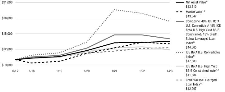 6/29/17资产净值1,21.51%35.57% 5.52%市值1,2-2.18 % 6.87% 4.87%综合:40% ICE BofA U.S. Convertibles/45% ICE BofA U.S. High Yield BB-B Constrained/15% Credit Suisse Leveraged Loan Index1,4-5.03 % 5.89% 6.21% ICE BofA U.S. Convertibles Index1,4-7.96% 9.85% 10.39%5ICE BofA美国高收益BB-B约束指数1,4-4.64% 2.95% 3.13%5瑞士信贷杠杆贷款指数1,41.12% 3.54% 3.77%5所有的回报都是过去的表现,并不能保证将来的结果。当前性能可能高于或低于所显示的性能。请访问Virtus.com,获取截至最近一个月末的性能数据。1/31终了期间增加10000美元这张图显示了2017年6月29日(基金成立日期)对基金的假设投资10000美元在所示年份的价值变化。为了进行比较,同样的投资也显示在所示的指数中。