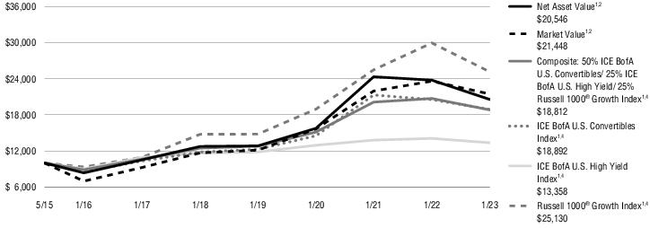 5/26/15资产净值1,2-13.49%310.01% 9.82%市值1,2-9.06 % 12.92% 10.43%综合:50% ICE BofA U.S. Convertibles/25% ICE BofA U.S. High Yield/25% Russell 1000®增长指数1,4-9.15 % 8.58% 8.56% ICE BofA U.S. Convertibles Index1,4-7.96% 9.85% 8.62%5ICE美银美国高收益指数1,4-5.14% 2.77% 3.84%5罗素1000®增长指数1,4-16.02% 11.22% 12.73%5所有的回报都是过去的表现,并不能保证将来的结果。当前性能可能高于或低于所显示的性能。请访问Virtus.com,获取截至最近一个月末的性能数据。1/31终了期间增加10000美元这张图显示了2015年5月26日(基金成立日期)对基金的假设投资10000美元在所示年份的价值变化。为了进行比较,同样的投资也显示在所示的指数中。