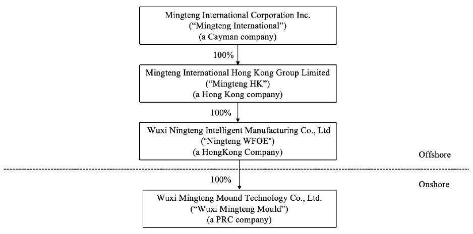 在本招股章程通篇中,除非文意另有所指,任何提述“铭腾国际”均指开曼群岛控股公司Mingteng International Corporation Inc.,任何提述“我们”、“我们”、“我们的公司”、“本公司”、“我们的”均指铭腾国际及其附属公司。“中国子公司”指铭腾国际根据中华人民共和国、“中国”或“中国”法律成立的子公司。