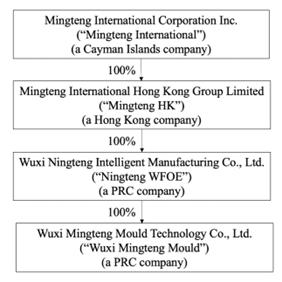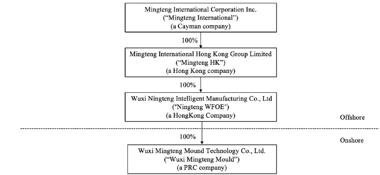 铭腾国际是一家开曼群岛控股公司,不进行任何自己的业务。它通过中国子公司,特别是无锡铭腾模具科技有限公司或无锡铭腾模具开展其在中国的所有业务。铭腾国际通过股权所有权控制中国子公司,不采用可变利益实体结构。由于我们的公司结构,对投资者来说存在独特的风险。此外,中国监管机构可能会改变有关我们经营所在行业的外资所有权的规则和规定,这可能会导致我们的经营发生重大变化,或者我们的普通股价值出现重大下降或消除。投资者应注意,他们不会直接持有我们中国子公司的股权,而只会持有控股公司铭腾国际的股权。请参阅“风险因素–与在中国开展业务相关的风险–中国政府对我们必须开展业务活动的方式施加重大影响,这可能导致我们的运营和/或我们普通股的价值发生重大变化。中国政府可能随时干预或影响我们的运营,这可能导致我们的运营和我们普通股的价值发生重大变化。此外,政府和监管机构的干预可能会严重限制或完全阻碍我们向投资者提供或继续提供证券的能力,并导致此类证券的价值大幅下降或一文不值”,第31页。