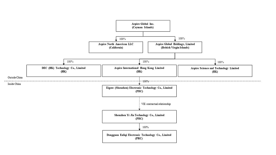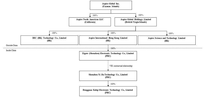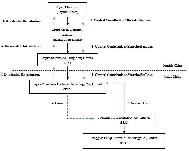 投资我们的普通股是高度投机的,涉及很大程度的风险。我们是一家在开曼群岛注册成立的控股公司。作为一家控股公司,我们没有自己的实质性业务, 我们通过在中华人民共和国成立的经营实体开展大部分业务, 或者中国, 主要是我们的可变利益实体及其子公司, 总的来说, VIE。由于中国法律对某些互联网相关业务的外资所有权的限制,我们将来可能会探索和运营, 我们对VIE没有任何股权, 相反,我们通过某些合同安排获得VIE业务运营的经济利益。我们在招股说明书中提供的普通股是我们的开曼群岛控股公司的股票,该公司与关联运营公司保持服务协议。中国的监管机构可能会禁止我们的结构, 这可能会导致我们的业务发生重大变化,我们的证券价值可能会下降或变得一文不值。关于我们的公司结构和VIE合同安排的描述, 参见第55页的“公司结构”。我们公司的现金流结构如下:(1)我们的外商独资企业, 艾盖特(深圳)电子科技有限公司, Limited), 将通过出资或贷款的方式从Aspire获得资金;(2)我们的外商独资企业可能会进一步向我们的VIE提供贷款, 深圳市亿嘉科技有限公司, 有限;(3)此外, 我们的VIE可以向第三方客户以及Aspire或其子公司出售产品,并从这些销售中获得资金;(4)根据《业务合作协议》,我们的VIE向Aspire提供的资金将作为服务费支付给我们的WFOE, 我们的外商投资企业可以向香港子公司分配股利或者偿还股东贷款, 这反过来又将这些资金分配或以其他方式转移到BVI子公司,并最终Aspire。自9月30日以来, 2020, 当VIE协议签署的时候, 没有支付给深圳亿嘉的款项。我们预计, 在一定程度上,深圳亿嘉的制造业务需要我们的资金, Aspire将以上述方式提供资金, 此外,深圳亿嘉的经营活动产生的正现金流量超过了其制造业务的需求, 它将把这些多余的资金转移到Aspire, 通过支付给eigate(深圳)。另请参见“风险因素-与我们的VIE协议有关的风险”,“风险因素-与我们的公司结构有关的风险”和“管理层对财务状况的讨论和分析”“和经营成果–通过我们的组织转移现金”,请参阅从本说明书第13页开始的“风险因素”,以讨论在决定购买我们的普通股之前应该考虑的信息。,