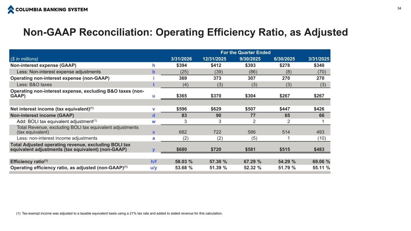 非美国通用会计准则对账:运营效率比,经调整后的季度末34(百万美元)3/31/202612/31/20259/30/20256/30/20253/31/2025非利息费用(GAAP)h $ 394 $ 412 $ 393 $ 278 $ 340减:非利息费用调整b(25)(39)(86)(8)(70)运营非利息费用(non-GAAP)i 369373307270270减:B & O税t(4)(3)(3)(3)运营非利息费用,不包括B & O税(non-GAAP)u $ 365 $ 370 $ 304 $ 267 $ 267净利息收入(税收等值)(1)v $ 596 $ 629 $ 507 $ 447 $ 426非利息收入(GAAP)d 8390776566加:BOLI税收等值调整(1)w 33221总收入,不包括BOLI税收等值调整(税收等值)x 682722586514493减:非利息收入调整a(2)(2)(5)1(10)调整后营业总收入,不包括BOLI税收等值调整(税收等值)(非美国通用会计准则)y $ 680 $ 720 $ 581 $ 515 $ 483效率比(1)h/f 58.03% 57.30% 67.29% 54.29% 69.06%运营效率比,经调整(非美国通用会计准则)(1)u/y 53.68% 51.39% 52.32% 51.79% 55.11%(1)免税收入使用21%的税率调整为应税等值基础,并为此计算添加到规定的收入中。