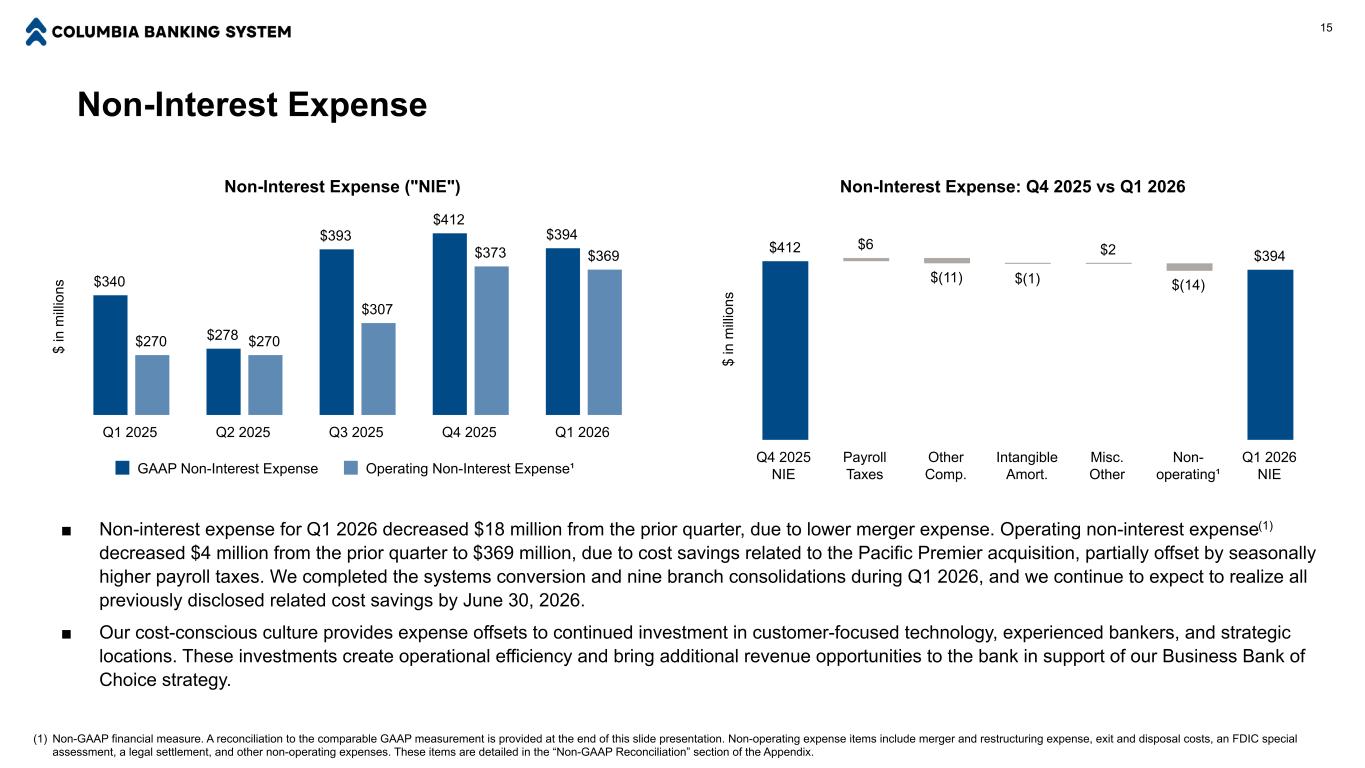 非利息收入14美元m病io ns总非利息收入66美元65美元77美元90美元83美元56美元66美元72美元88美元81美元GAAP非利息收入营业非利息收入丨2025年第一季度2025年第二季度2025年第三季度2025年第四季度2025年第一季度2026年第一季度■ 2026年第一季度非利息收入比上一季度减少700万美元。运营非利息收入(1)也比上一季度减少700万美元,至8100万美元,原因是继上一季度表现强劲之后,掉期、银团和国际银行业务收入减少,以及预期第一季度典型的客户活动放缓。■我们的Business Bank of Choice战略采用协作团队方法,为我们的客户提供基于需求的解决方案,这加深了关系并提供了可持续的核心费用收入增长。我们的趋势反映出,在过去12个月中,资金管理、卡和商户活动、财富管理以及其他产品收入的贡献越来越大。$ in m ill io ns Operating Non-Interest Income丨$ 56 $ 66 $ 72 $ 88 $ 81 Other Treasury MGMT Card & Merchant Wealth MGMT Deposit Services Mortgage Loan Income Q1 2025 Q2 2025 Q3 2025 Q4 2025 Q1 2026(1)Non-GAAP Financial Measure。本幻灯片演示文稿末尾提供了与可比GAAP计量的对账。非经营性非利息收入项目包括投资证券的收益(损失)、掉期衍生工具的收益(损失)、按公允价值持有用于投资的贷款的收益(损失)、由于估值输入或假设导致的MSR公允价值变动以及MSR套期保值收益(损失)。这些项目在附录的“非公认会计原则和解”部分中有详细说明。