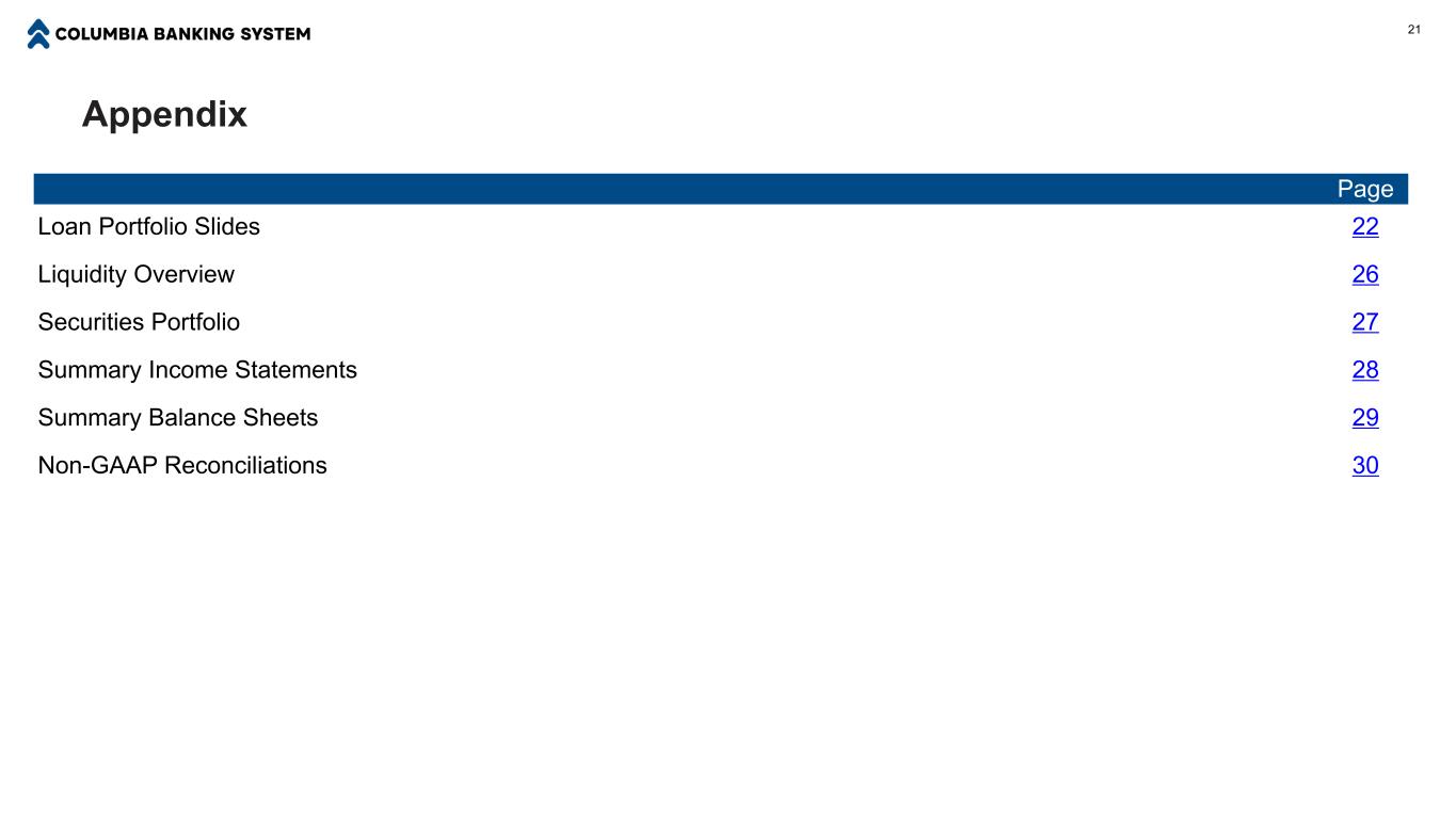 我们多元化的商业银行业务模式和强大的零售网络支持我们颗粒状、高质量的存款基础非利息、33%的活期、20%的货币市场、31%的储蓄、5%的时间、11%的全企业存款构成20 ■截至2026年3月31日,存款为535亿美元,以按业务线、行业和地域多样化的颗粒状基础为代表。我们的平均客户账户余额为4.4万美元。(1)■我们使用公开和经纪存款作为定期债务以外的资金来源,这会影响我们全企业存款组合的构成。我们认为,我们的客户存款构成(1)更能说明哥伦比亚核心存款专营权的质量。我们银行家的活动旨在保护我们基于关系的特许经营的质量,同时产生净客户余额增长,以随着时间的推移减少对非核心资金来源的需求。商业、29%商业-小型企业、25%消费、37%经纪、3%公共及其他、6%存款按类别客户存款构成(1)非利息、34%活期、20%货币市场、31%储蓄、5%时间、10%(1)不包括所有公共、行政和经纪存款,详见附录“流动性概览”幻灯片。截至2026年3月31日,不包括在内的余额占存款总额的9%。这是一项非公认会计准则财务指标。535亿美元535亿美元489亿美元