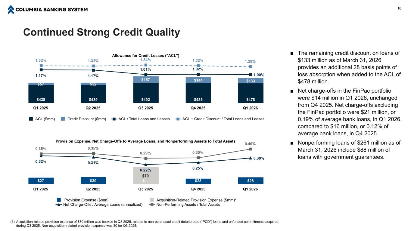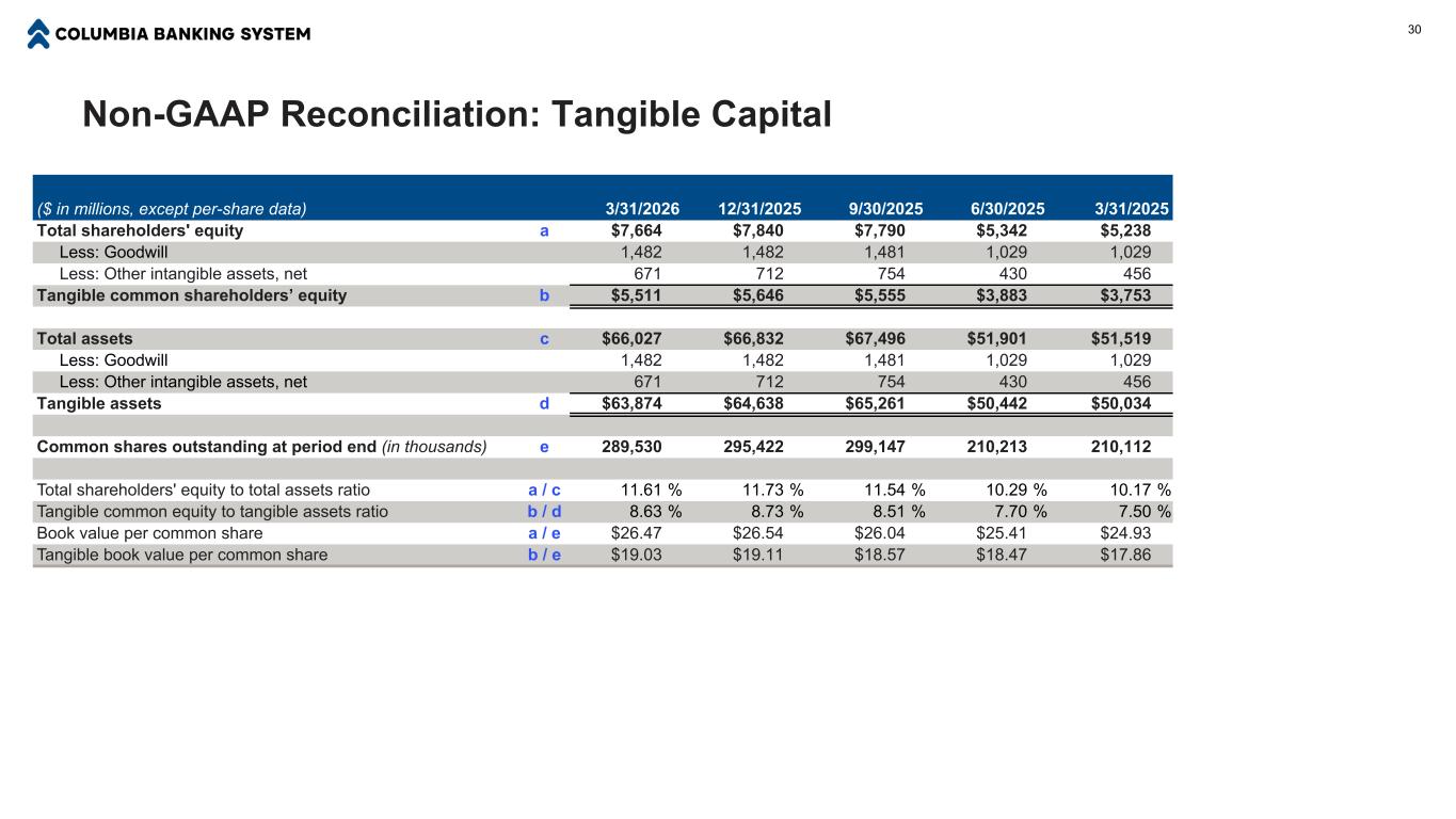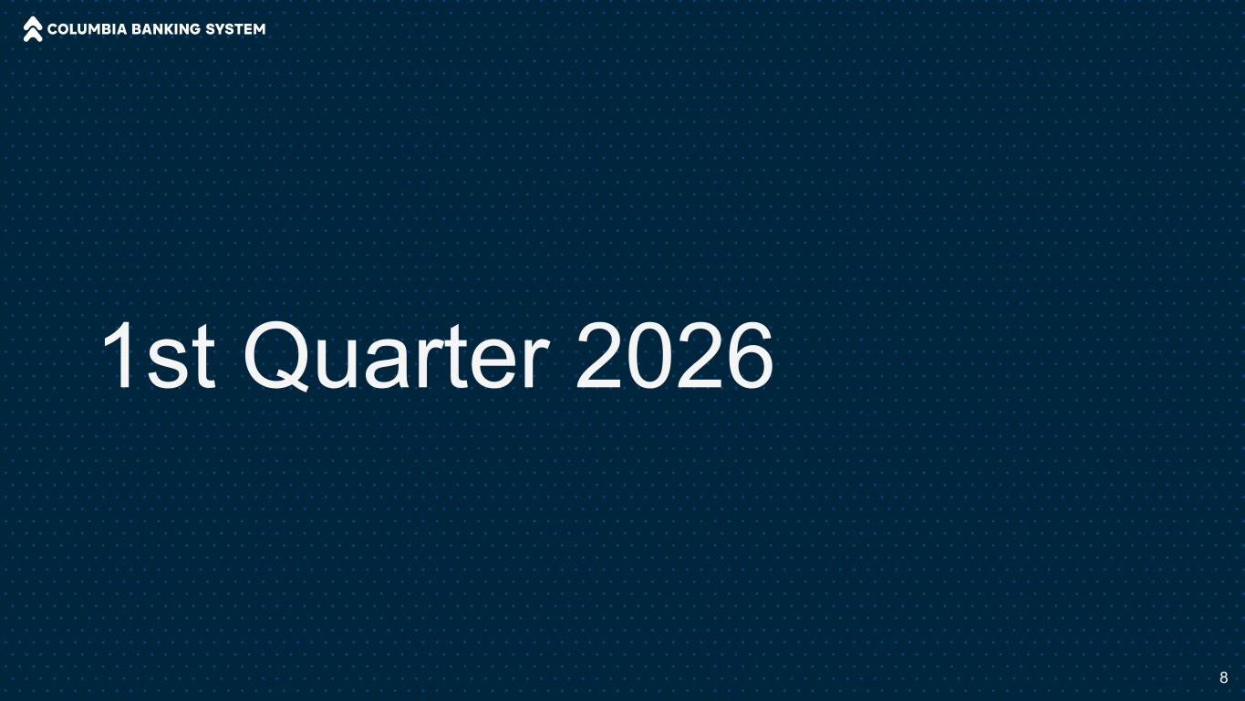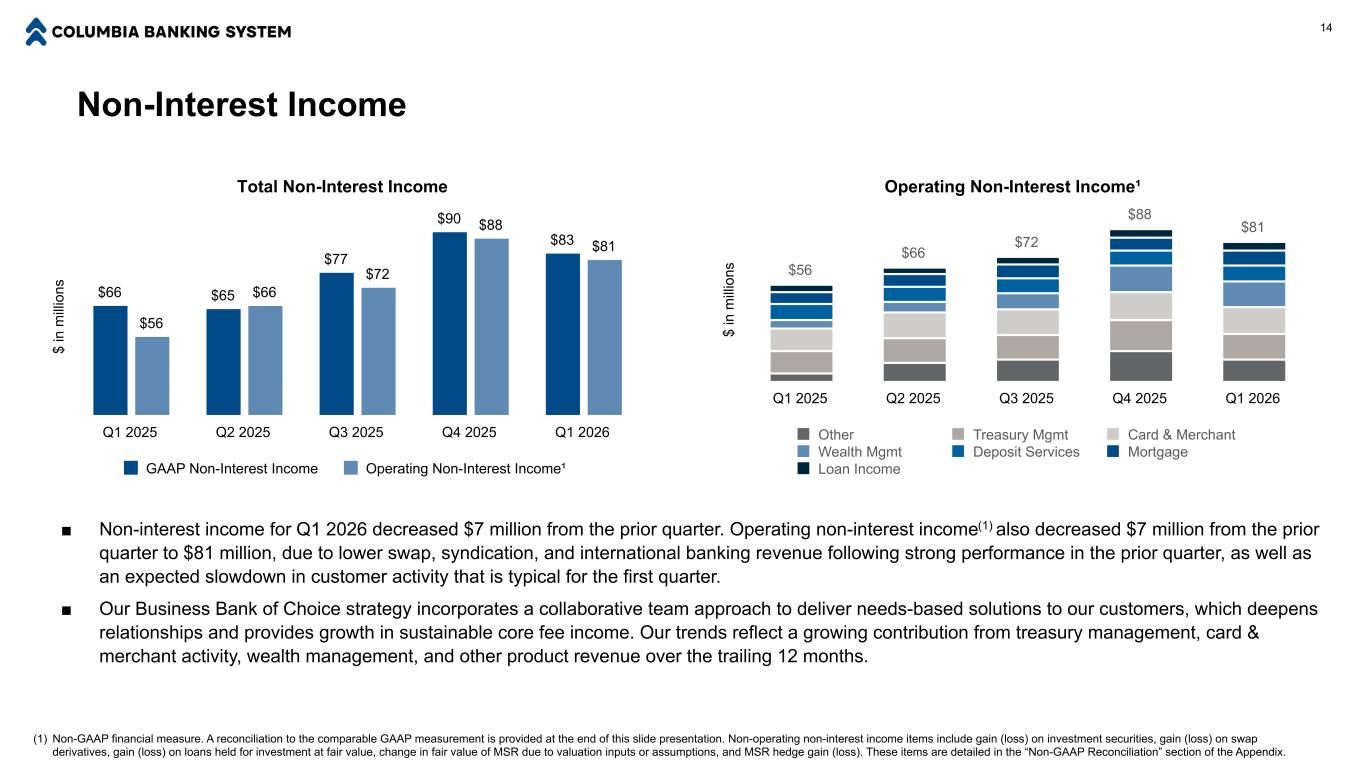 净收入和每股收益10美元,以百万美元计Net income $ 87 $ 152 $ 96 $ 215 $ 192 $ 139 $ 160 $ 204 $ 243 $ 209 GAAP Net income Operating Net Income丨Q1 2025 Q2 2025 Q3 2025 Q4 2025 Q1 2026 ■ Columbia报告2026年第一季度的净收入和EPS分别为1.92亿美元和0.66美元。在运营基础上,(1)净收入和EPS分别为2.09亿美元和0.72美元。■较2025年Q1的增长反映了新增Pacific Premier、我们的资产负债表优化目标持续取得进展以及严格的费用管理。■与2025年第四季度相比的下降反映了预期的收入正常化,因为1700万美元的净利息收入项目没有重复,如净利息收入和净息差下滑所详述,特别是2025年第四季度的收入强劲。(1)Non-GAAP财务计量。本幻灯片演示文稿末尾提供了与可比GAAP计量的对账。非经营性项目包括投资证券的收益(损失)、掉期衍生工具的收益(损失)、按公允价值持有用于投资的贷款的收益(损失)、由于估值输入或假设导致的MSR公允价值变动、MSR套期保值收益(损失)、合并和重组费用、退出和处置成本、FDIC特别评估、法律和解以及其他非经营费用。这些项目在附录的“非公认会计原则和解”部分中有详细说明。每股收益-稀释后(“EPS”)0.41美元0.73美元0.40美元0.72美元0.66美元0.67美元0.76美元0.85美元0.82美元0.72美元GAAP每股收益-稀释后营业每股收益-摊薄丨Q1 2025Q2 2025Q3 2025Q4 2025Q1 2026