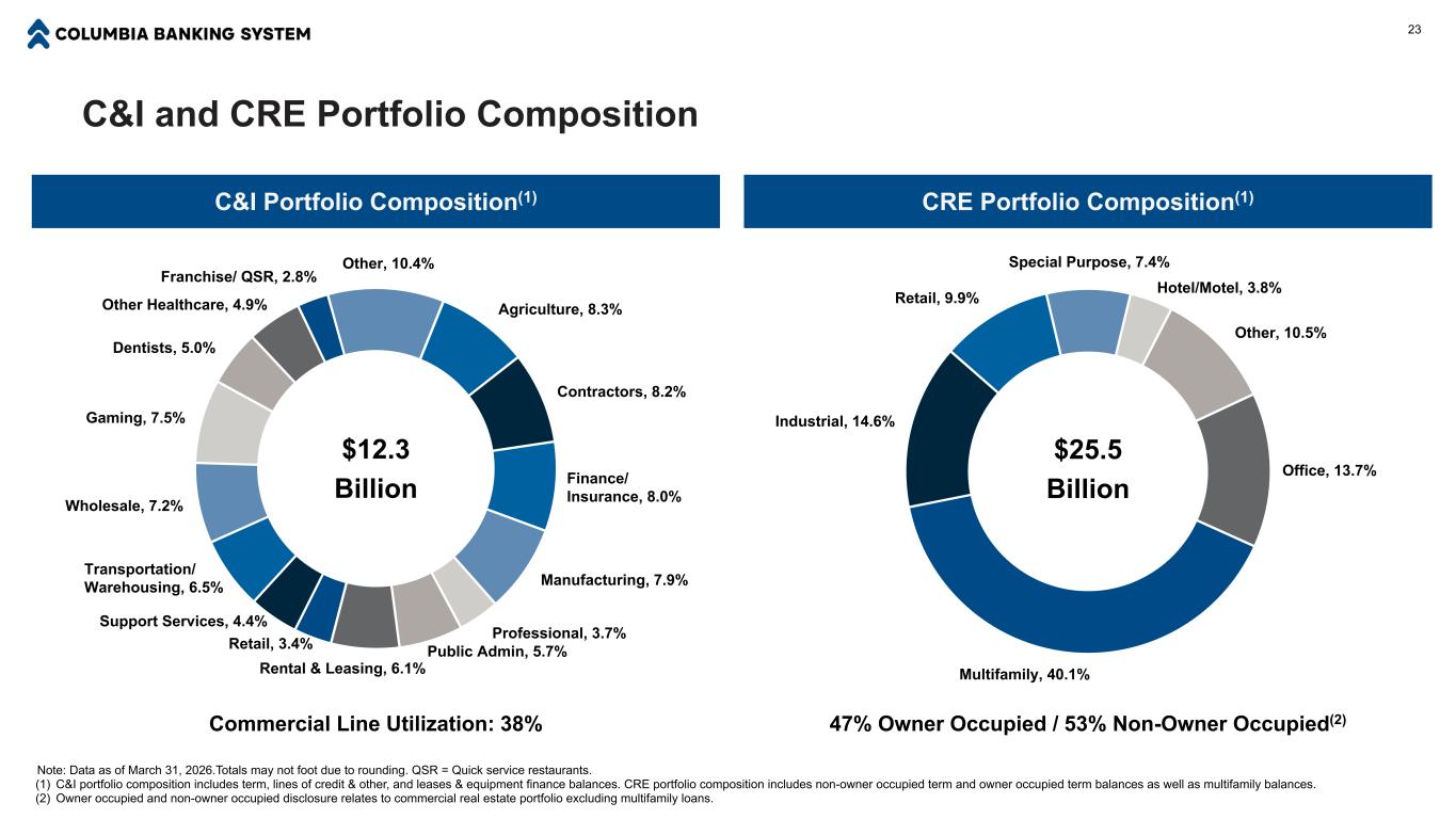 C & I和CRE投资组合构成农业、8.3%承包商、8.2%金融/保险、8.0%制造业、7.9%专业、3.7%公共管理、5.7%租赁、6.1%零售、3.4%支持服务、4.4%运输/仓储、6.5%批发、7.2%博彩、7.5%牙医、5.0%其他医疗保健、4.9%特许经营/QSR、2.8%其他、10.4%办公、13.7%多户家庭、40.1%工业、14.6%零售、9.9%特殊用途、7.4%酒店/汽车旅馆、3.8%其他、10.5% CRE投资组合构成(1)C & I投资组合构成(1)注:截至2026年3月31日的数据。由于四舍五入,总数可能不够。QSR =快捷服务餐厅。(1)C & I投资组合构成包括期限、信用额度及其他、租赁及设备融资余额。CRE投资组合构成包括非业主占用期限和业主占用期限余额以及多户家庭余额。(2)自住和非自住披露涉及商业地产组合,不包括多户贷款。47%业主占用/53%非业主占用(2)商业线路利用:38% 23123亿美元255亿美元