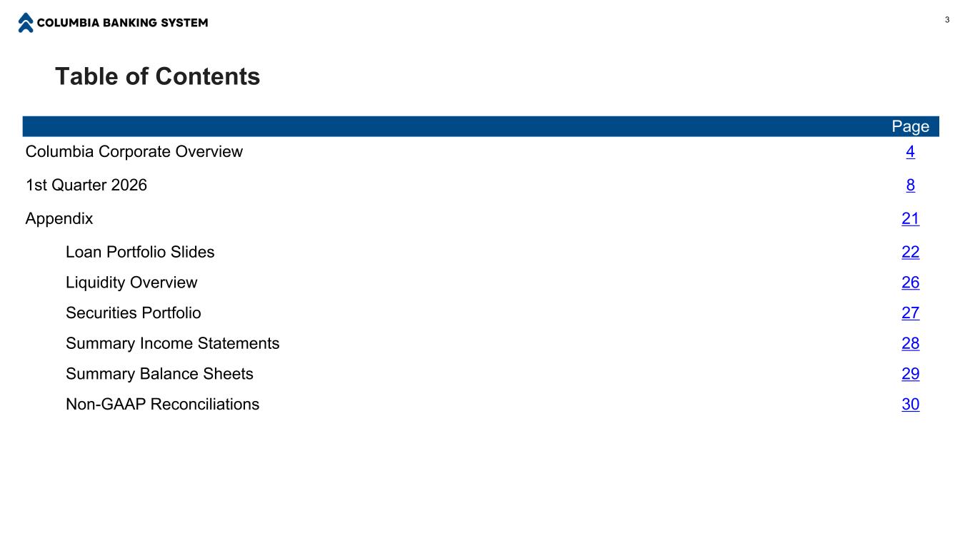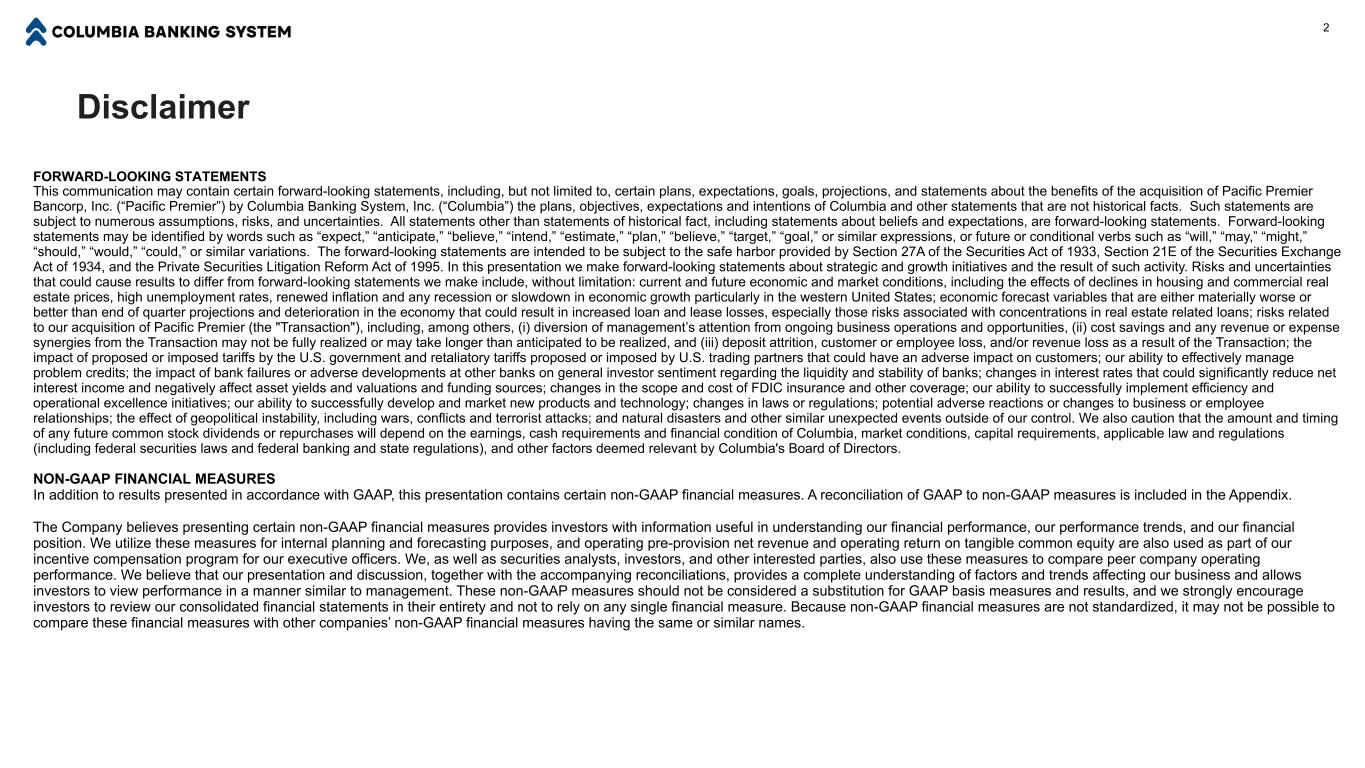 免责声明前瞻性陈述本通讯可能包含某些前瞻性陈述,包括但不限于某些计划、期望、目标、预测,以及有关Pacific Premier Bancorp, Inc.(“Pacific Premier”)被Columbia Banking System, Inc.银行系统公司(“Columbia”)收购的益处的陈述Columbia的计划、目标、期望和意图以及其他非历史事实的陈述。此类陈述受到众多假设、风险和不确定性的影响。除历史事实陈述之外的所有陈述,包括关于信念和期望的陈述,都是前瞻性陈述。前瞻性陈述可以通过“预期”、“预期”、“相信”、“打算”、“估计”、“计划”、“相信”、“目标”、“目标”或类似表达方式,或未来或条件动词,如“将”、“可能”、“可能”、“应该”、“将”、“可能”或类似变体来识别。这些前瞻性陈述旨在遵守1933年《证券法》第27A条、1934年《证券交易法》第21E条和1995年《私人证券诉讼改革法案》提供的安全港。在本演示文稿中,我们对战略和增长举措以及此类活动的结果做出前瞻性陈述。可能导致结果与我们所做的前瞻性陈述不同的风险和不确定性包括但不限于:当前和未来的经济和市场状况,包括住房和商业房地产价格下跌、高失业率、通胀重新抬头以及经济增长出现任何衰退或放缓的影响,尤其是在美国西部;经济预测变量要么实质上比季度末的预测更差或更好,要么经济恶化可能导致贷款和租赁损失增加,尤其是与房地产相关贷款集中相关的风险;与我们收购Pacific Premier(“交易”)相关的风险,其中包括:(i)将管理层的注意力从持续的业务运营和机会上转移,(ii)成本节约和交易产生的任何收入或费用协同效应可能无法完全实现或可能需要比预期更长的时间才能实现,以及(iii)存款减员、客户或员工流失,交易导致的和/或收入损失;美国政府提议或征收的关税以及美国贸易伙伴提议或征收的可能对客户产生不利影响的报复性关税的影响;我们有效管理问题信贷的能力;银行倒闭或其他银行的不利发展对投资者关于银行流动性和稳定性的一般情绪的影响;利率变化这可能会显着降低净利息收入,并对资产收益率、估值和资金来源产生负面影响;FDIC保险和其他保险范围和成本的变化;我们成功实施效率和卓越运营举措的能力;我们成功开发和营销新产品和技术的能力;法律或法规的变化;对业务或员工关系的潜在不良反应或变化;地缘政治不稳定的影响,包括战争、冲突和恐怖袭击;以及自然灾害和我们无法控制的其他类似意外事件。我们还提醒,未来任何普通股股息或回购的金额和时间将取决于哥伦比亚的收益、现金要求和财务状况、市场状况、资本要求、适用的法律和法规(包括联邦证券法和联邦银行和州法规),以及哥伦比亚董事会认为相关的其他因素。非公认会计准则财务指标除了按照公认会计准则列报的结果外,本演示文稿还包含某些非公认会计准则财务指标。GAAP与非GAAP措施的对账包含在附录中。该公司认为,提供某些非公认会计准则财务指标可为投资者提供有用的信息,以了解我们的财务业绩、业绩趋势和财务状况。我们将这些措施用于内部规划和预测目的,运营拨备前净收入和有形普通股的运营回报率也被用作我们对执行官的激励薪酬计划的一部分。我们,以及证券分析师、投资者、其他利益相关方,也用这些衡量标准来比较同行公司的经营业绩。我们认为,我们的介绍和讨论,连同随之而来的对账, 提供对影响我们业务的因素和趋势的完整理解,并允许投资者以类似于管理层的方式看待业绩。这些非GAAP衡量标准不应被视为对GAAP基础衡量标准和结果的替代,我们强烈鼓励投资者全面审查我们的合并财务报表,不要依赖任何单一的财务衡量标准。由于非GAAP财务指标不标准化,可能无法将这些财务指标与名称相同或相似的其他公司的非GAAP财务指标进行比较。2
