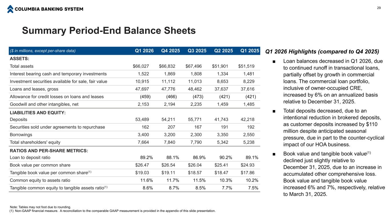 简要利润表注:由于四舍五入的原因,表格可能不够用。(1)Non-GAAP财务计量。本幻灯片演示文稿末尾提供了与可比GAAP计量的对账。截至本季度(百万美元,每股数据除外)2026年第一季度2025年第三季度2025年第二季度2025年第一季度拨备前净利息收入594美元627美元505美元446美元425美元信贷损失准备金2823703027拨备后净利息收入566604435416398非利息收入8390776566非利息费用394412393278340所得税拨备前收入255282119203124所得税拨备6367235137净收入192美元215美元96美元152美元87美元每股收益,稀释后0.66美元0.72美元0.40美元0.73美元0.41美元运营非利息费用(1)369美元373美元307美元270美元270美元拨备前净收入(1)283美元305美元189美元233美元151美元运营拨备前净收入(1)306美元342美元270美元242美元211美元运营净收入(1)209美元243美元204美元160美元139美元每股运营收益,稀释后(1)0.72美元0.82美元0.85美元0.76美元0.67美元28 2026年第一季度亮点(与2025年第四季度相比)■净利息收入减少3300万美元,因为上一季度包括与获得的定期存款溢价摊销和本季度没有重复的加速偿还贷款相关的1700万美元净利息收入。其余减少反映平均生息资产余额减少。■ ■非利息收入减少700万美元,部分原因是在上一季度表现强劲之后,掉期、银团和国际银行业务收入减少,以及预计第一季度的客户活动将放缓。■非利息支出减少1800万美元,原因是合并支出减少。■拨备费用为2800万美元,上一季度为2300万美元。