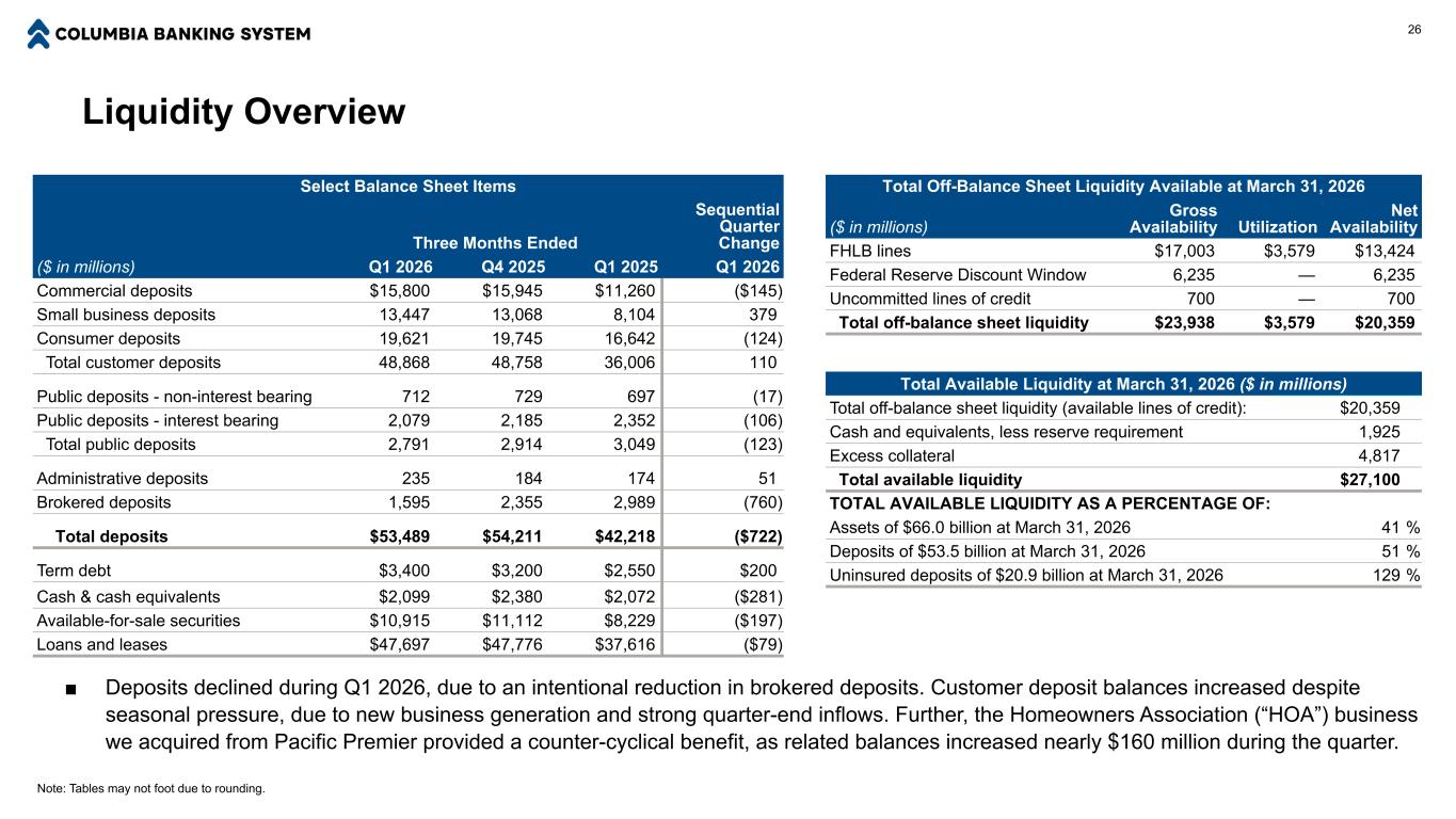 流动性概览截至2026年3月31日的可用流动性总额(百万美元)表外流动性总额(可用信贷额度):20,359美元现金及等价物,减去准备金要求1,925超额抵押品4,817总可用流动性27,100美元总可用流动性百分比:截至2026年3月31日的资产为660亿美元41%截至2026年3月31日的存款为535亿美元51%截至2026年3月31日的无保险存款为209亿美元129%截至3月31日的表外流动性总额,2026年(百万美元)总可用性利用率净可用性FHLB额度17,003美元3,579美元13,424美元美联储贴现窗口6,235 — 6,235未承诺信贷额度700 — 700表外流动性总额23,938美元3,579美元20,35926 ■ 2026年第一季度存款下降,原因是有意减少中介存款。由于新业务的产生和强劲的季度末流入,尽管存在季节性压力,客户存款余额仍有所增加。此外,我们从Pacific Premier收购的房主协会(“HOA”)业务提供了逆周期收益,相关余额在本季度增加了近1.6亿美元。选择资产负债表项目三个月结束的连续季度变化(百万美元)2026年第一季度2025年第四季度2025年第一季度2026年第一季度商业存款15,800美元15,945美元11,260美元(145美元)小企业存款13,44713,0688,104379消费者存款19,62119,74516,642(124)客户存款总额48,86848,75836,006110公众存款-不计息712729697(17)公众存款-计息2,0792,1852,352(106)公众存款总额2,7912,9143,049(123)行政存款23518417451经纪存款1,5952,352,989(760)存款总额53,489美元54,211美元42,218美元(722美元)定期债务3,400等价物$ 2,099 $ 2,380 $ 2,072($ 281)可供出售证券$ 10,915 $ 11,112 $ 8,229($ 197)贷款和租赁$ 47,697 $ 47,776 $ 37,616($ 79)注:由于四舍五入,表格可能不够用。