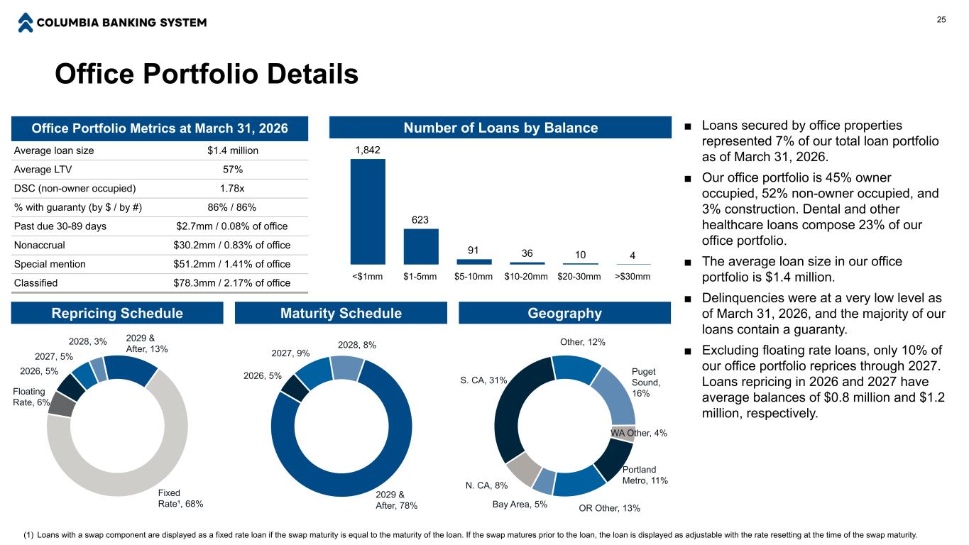 办公组合详情普吉特海湾、16%西澳其他、4%波特兰地铁、11%或其他、13%湾区、5% N. 加利福尼亚州、8% S. 加利福尼亚州、31%其他、12%截至3月31日的办公组合指标,2026年平均贷款规模140万美元平均LTV 57% DSC(非业主占用)1.78x %有担保(按美元/按#计)86%/86%逾期30-89天2.7mm/0.08%办公室非应计30.2mm/0.83%办公室特别关注51.2mm/1.41%办公室分类78.3mm/2.17%办公室贷款数量按余额地理25 ■截至2026年3月31日,由办公室物业担保的贷款占我们总贷款组合的7%。■我们的写字楼组合是45%自住,52%非自住,3%建设。牙科和其他医疗保健贷款占我们办公室投资组合的23%。■我们办公室投资组合的平均贷款规模为140万美元。■截至2026年3月31日,拖欠率处于非常低的水平,我们的大部分贷款都包含担保。■不包括浮动利率贷款,到2027年,我们办公室组合中只有10%会重新定价。2026年和2027年贷款重新定价的平均余额分别为0.8百万美元和1.2百万美元。1,746441713876 < $ 1mm $ 1-5mm $ 5-10mm $ 10-20mm $ 20-30mm > $ 30mm2026,5% 2027,5% 2028,3% 2029 & after,13%固定利率丨68%浮动利率,6%重定价附表(1)含有掉期成分的贷款,如果掉期期限等于贷款期限,则显示为固定利率贷款。如果互换在贷款之前到期,则贷款显示为可调,在互换到期时利率重置。2026年,5% 2027年,9% 2028年,8% 2029年&后,78%到期时间表,1989671,84262396104