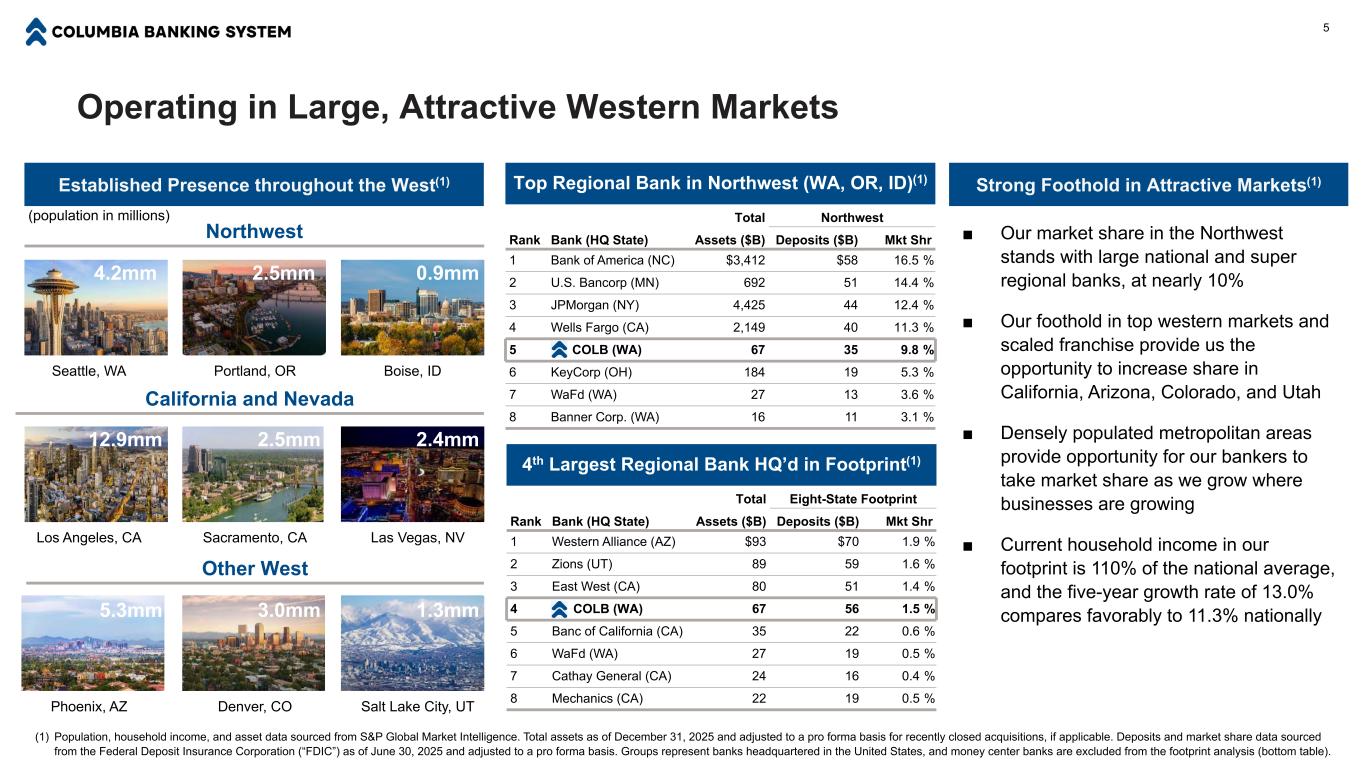 聚焦西部的区域强国4完成西部足迹(三)为什么是哥伦比亚?■首选商业银行战略培养细粒度、低成本的核心存款基础■引人注目的文化和规模社区银行业务模式培养了深厚的社区联系,同时也吸引和留住了顶尖的银行人才■规模化的西部专营权难以复制,提供了稀缺价值■有机会在加利福尼亚州和西部不断增长的大都市有机地获得份额,同时在西北部增加密度■强大的信贷质量得到了多元化、结构良好的支持,以及保守承销的贷款组合■稳健的资本生成支持长期有机增长并向股东回报Columbia C或PO ra te Ticker COLB市值(1)84亿美元股息收益率(1)5.1% Fi na NC ia ls a s of M ar ch 31,2026资产660亿美元贷款477亿美元存款535亿美元普通股一级资本比率(2)11.5%总资本比率(2)13.3%(1)截至2026年4月22日的市场数据。(2)监管资本比率是在完成和提交哥伦比亚监管报告之前的估计。(3)哥伦比亚总部位于华盛顿州塔科马,在美国西部经营着近350家分支机构,并在德克萨斯州设有房主协会(“HOA”)办事处(未图示)。