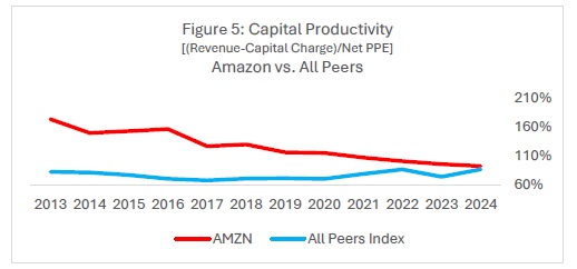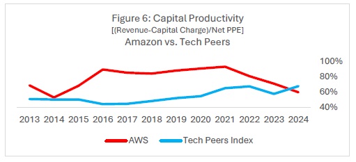 亚马逊资本生产率的下降影响了其每个主要细分市场,考虑到亚马逊旗下业务活动的广泛多样性,这一点很重要。图6显示了亚马逊网络服务公司最近的资本生产率下降,与已确定的科技行业同行相比:
