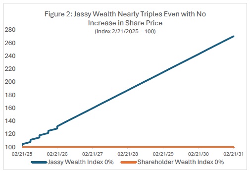 总体而言,Jassy将他的亚马逊财富(以每个归属日的收盘价估值的股票)增加了大约10倍于股东所享有的财富增长。我们纳入了实际支付薪酬(CAP)的计算,这显然与Jassy财富指数的整体增长相匹配,尽管波动性更大。展望未来,这种错位将更加严重,因为即使亚马逊股价每年增长0%,Jassy到2031年仍将把他的亚马逊财富增加270%。