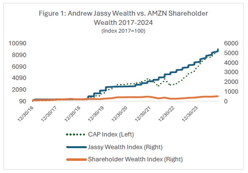 图1提供了一个令人信服的例证,说明Jassy的Amazon Wealth与股东所享受的回报之间的差距越来越大:9