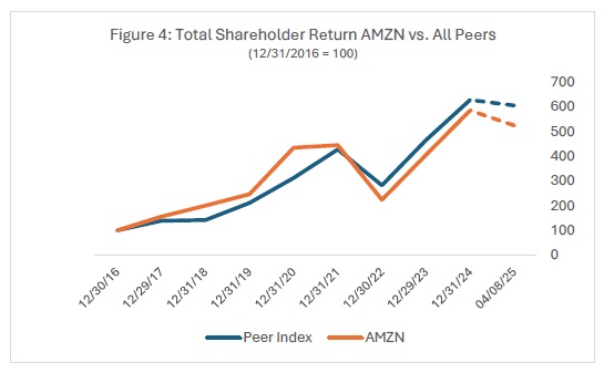 即使对于一家表现良好且未来前景光明的公司来说,这种惊人程度的错位也会令人不安。对亚马逊股东来说不幸的是,情况并非如此。在图4中,我们展示了亚马逊自2017年初以来的总股东回报率与亚马逊2025年代理声明第72页上提到的同行的市值加权指数之间的比较。